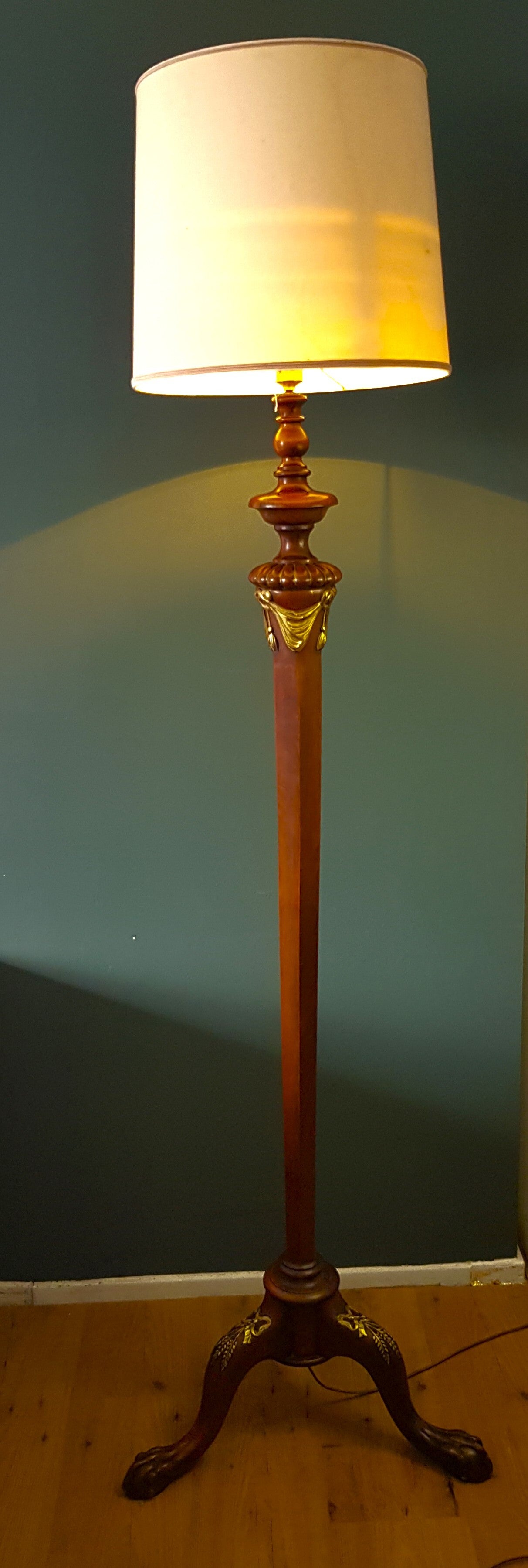 Een notenhouten vloerlamp met goud gelakte ornamenten; hoogte 160 cm.