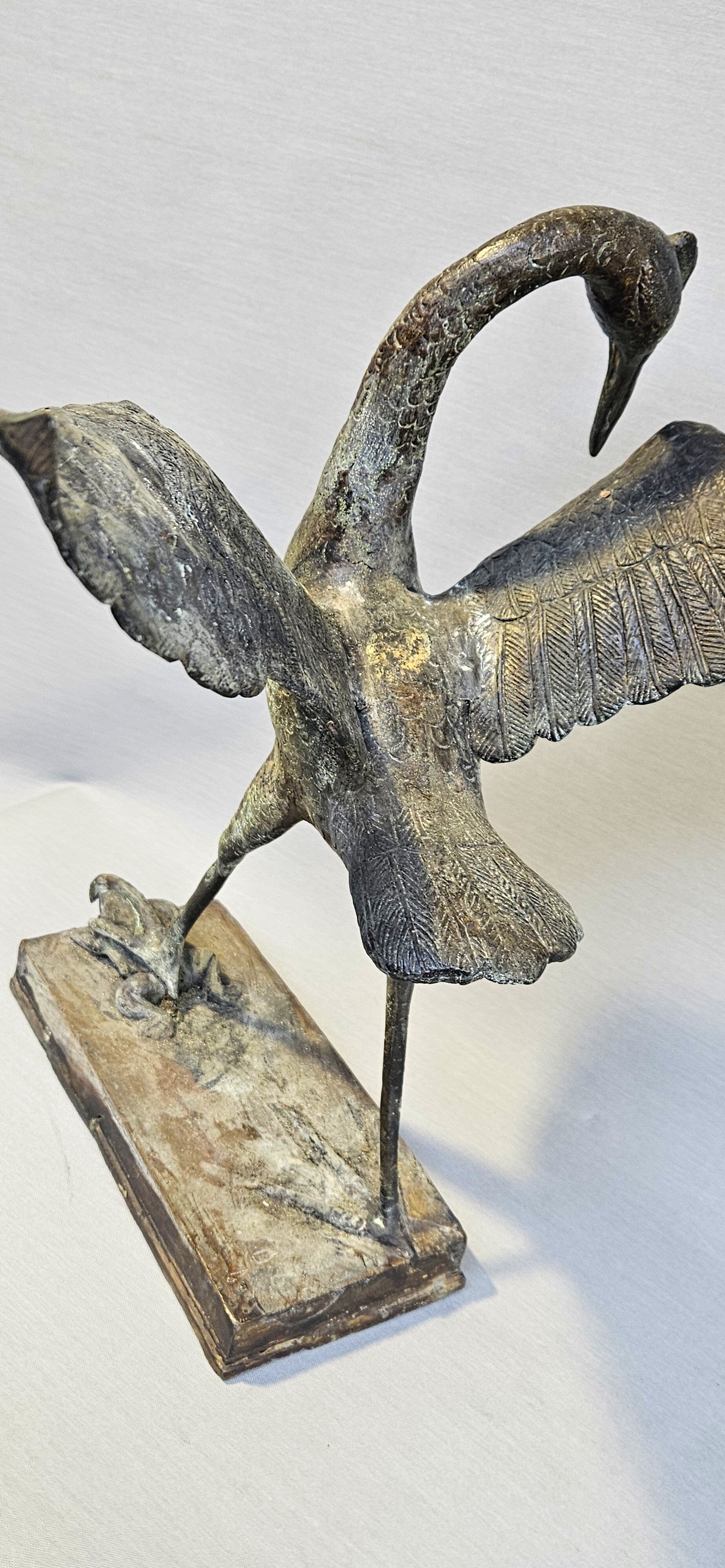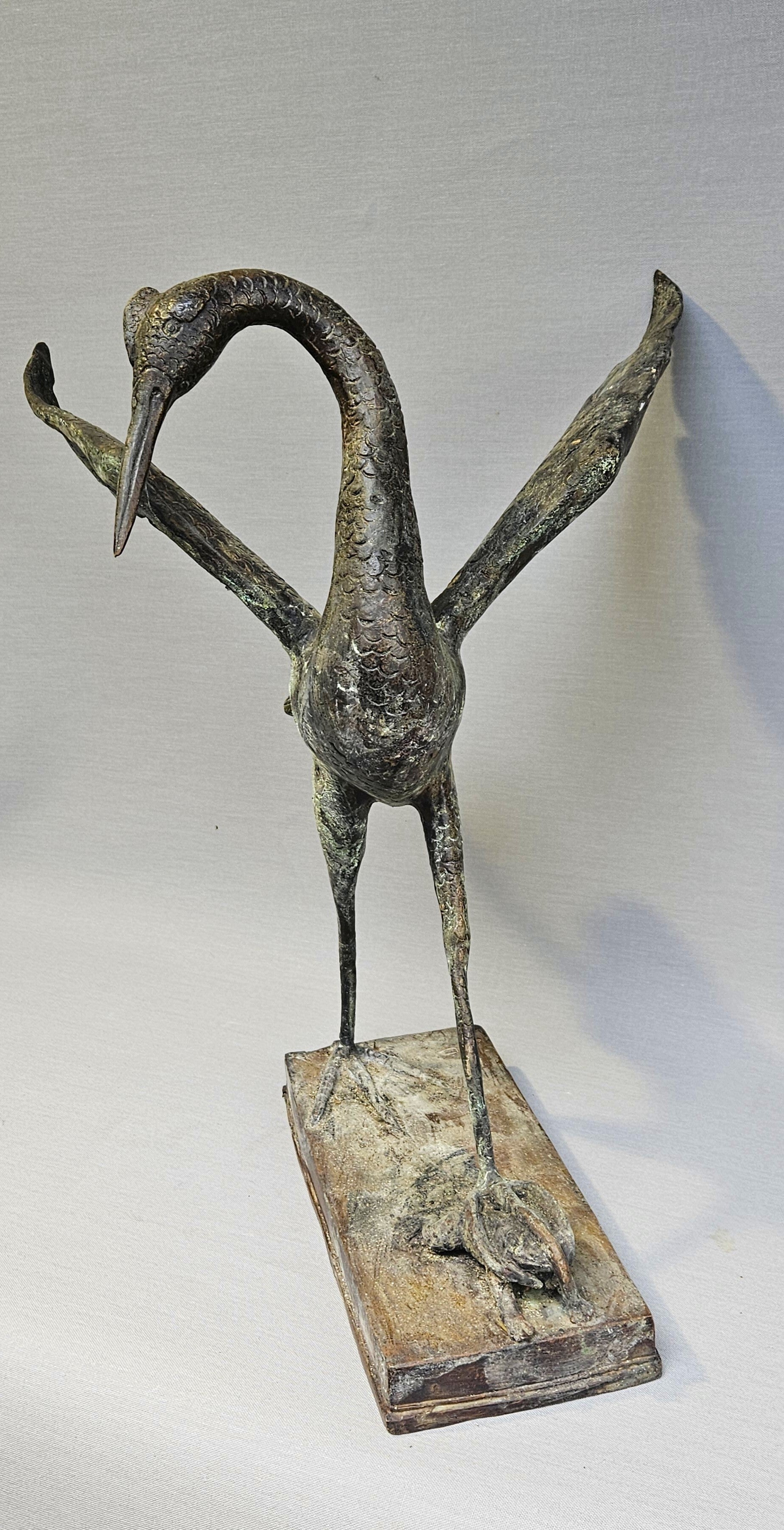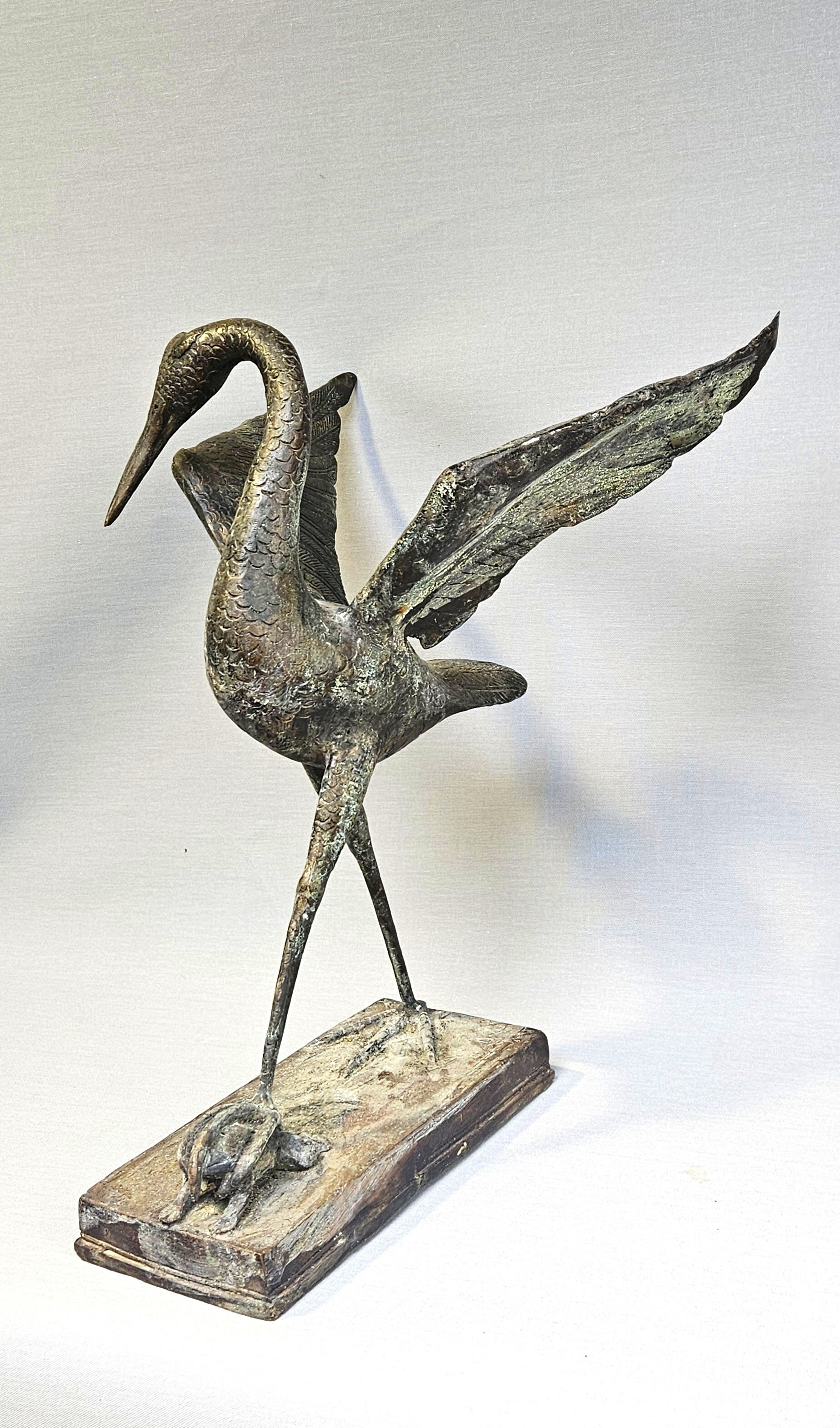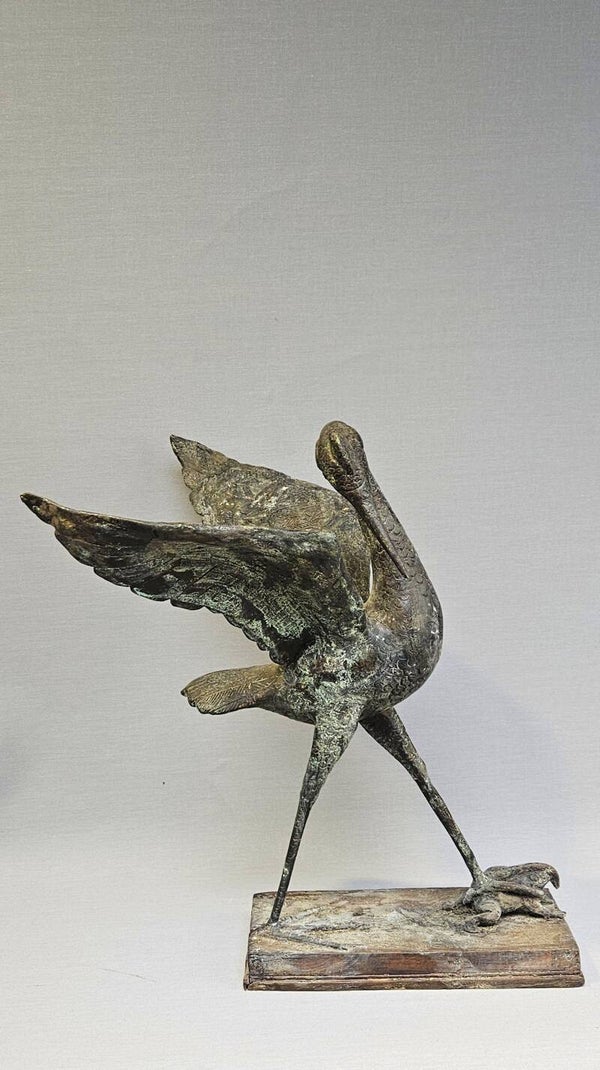 Een prachtig gedetailleerd bronzen sculptuur van een reiger (of watervogel) in een dynamische houding. Het beeld vangt een uniek moment uit de natuur: de reiger heeft met zijn poot een kikker gefixeerd op de ondergrond, wat zorgt voor een levendige en narratieve uitstraling.