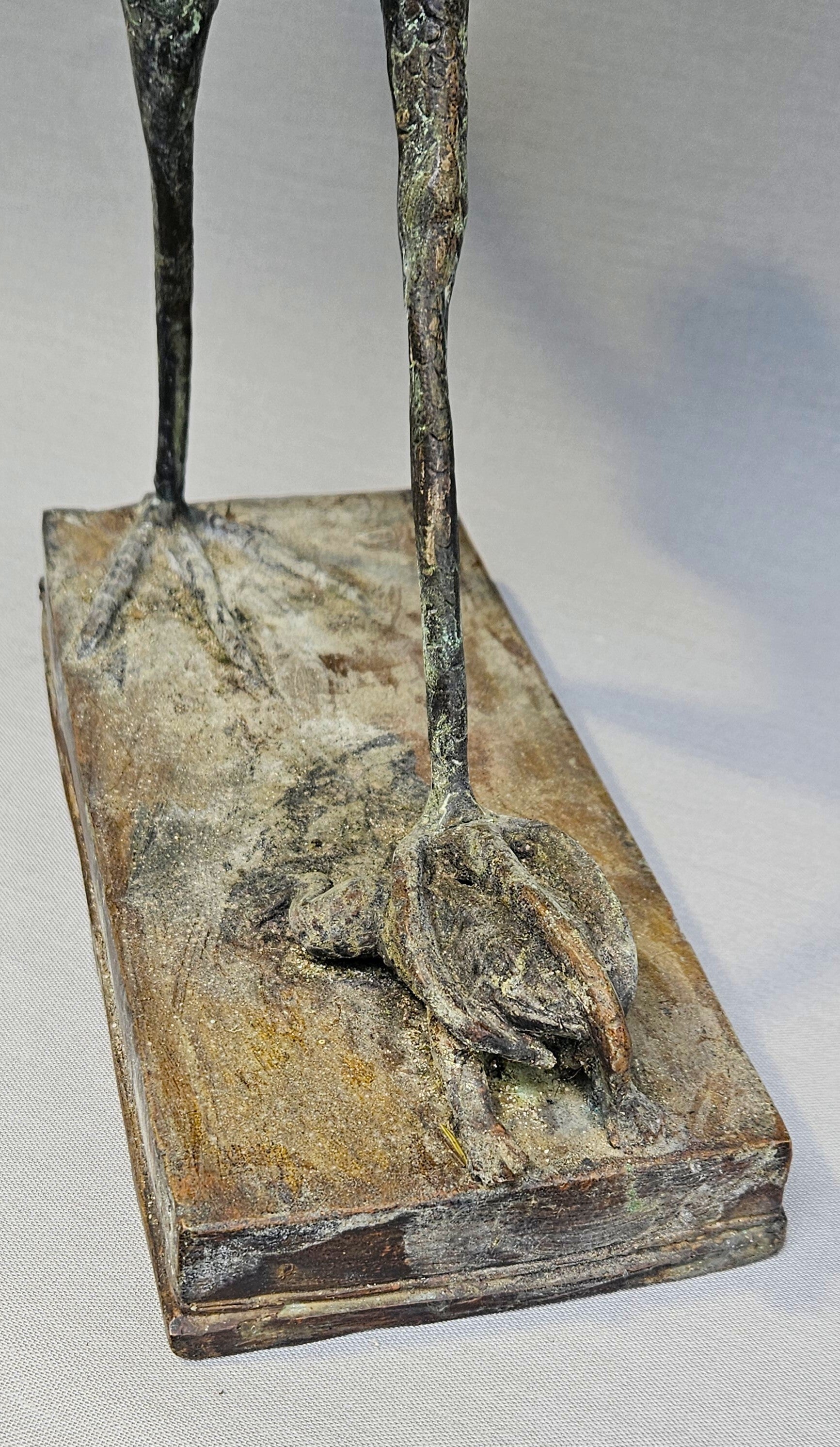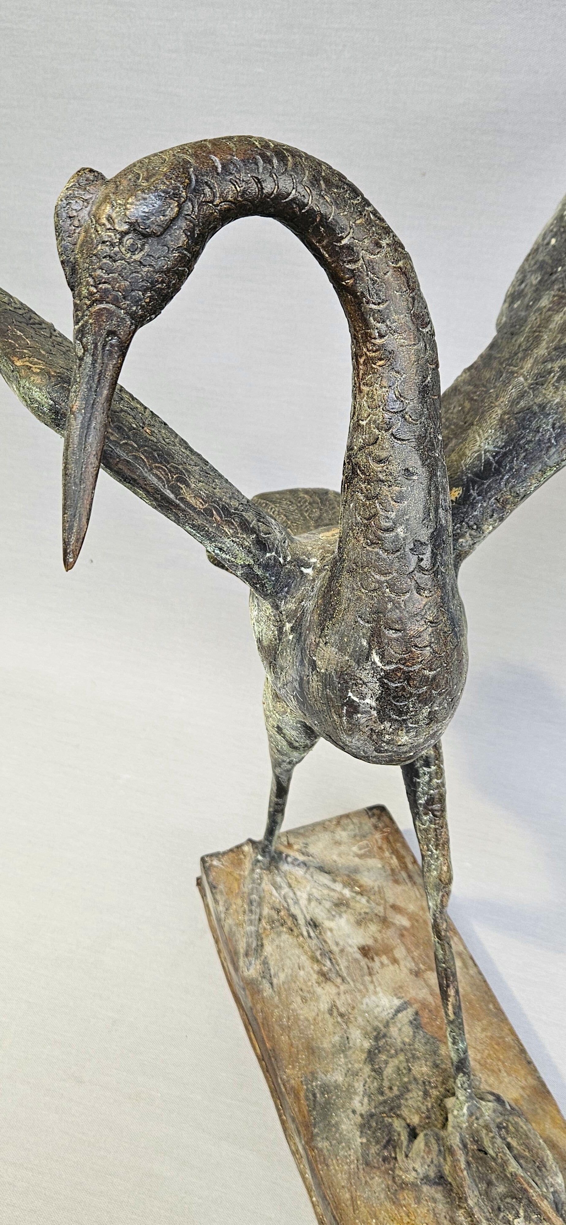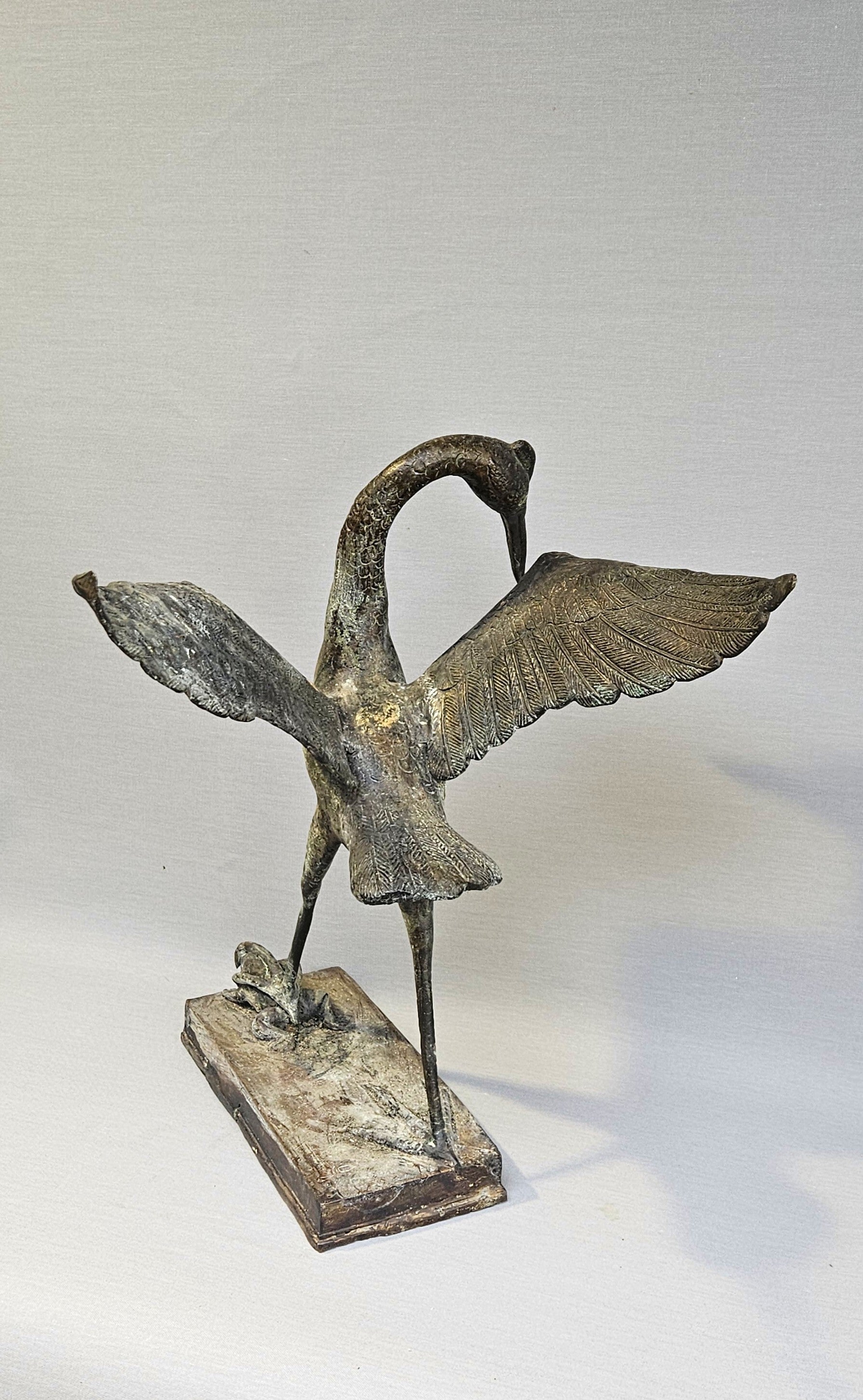 Het beeld is uitgevoerd in een expressieve, bijna impressionistische stijl met veel aandacht voor de textuur van de veren en de anatomie van de vogel. Door jarenlange plaatsing in een tuin heeft het brons een schitterende, authentieke groen-bruine patina ontwikkeld, wat het object een doorleefd en antiek karakter geeft.
