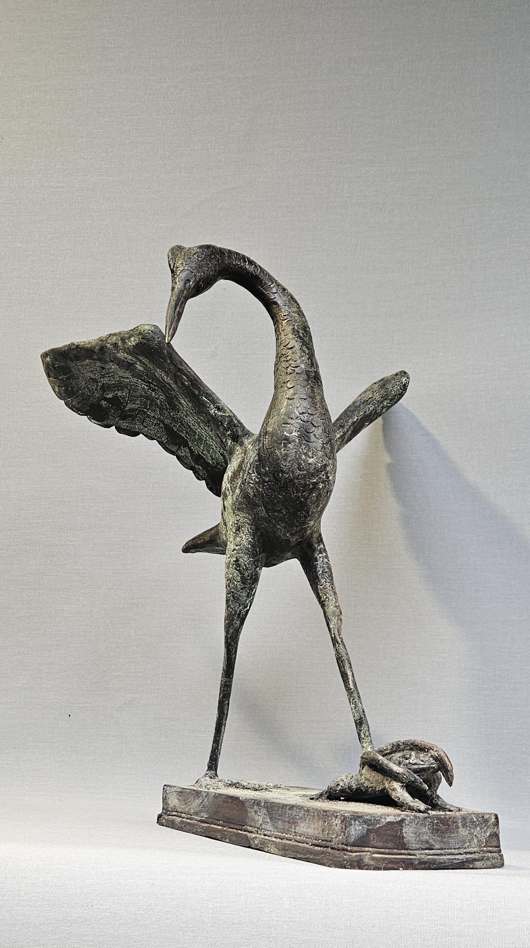Thema: Figuratief – Reiger met kikker op rechthoekige bronzen sokkel.