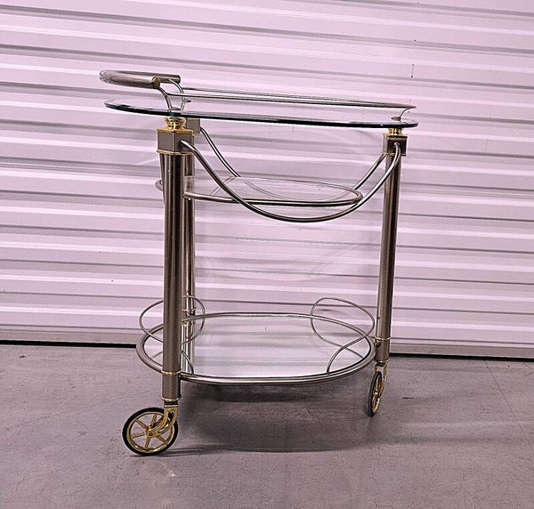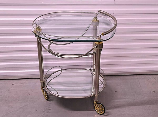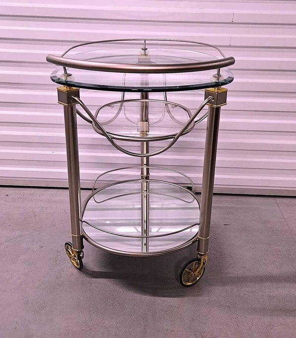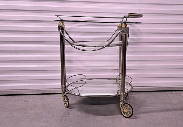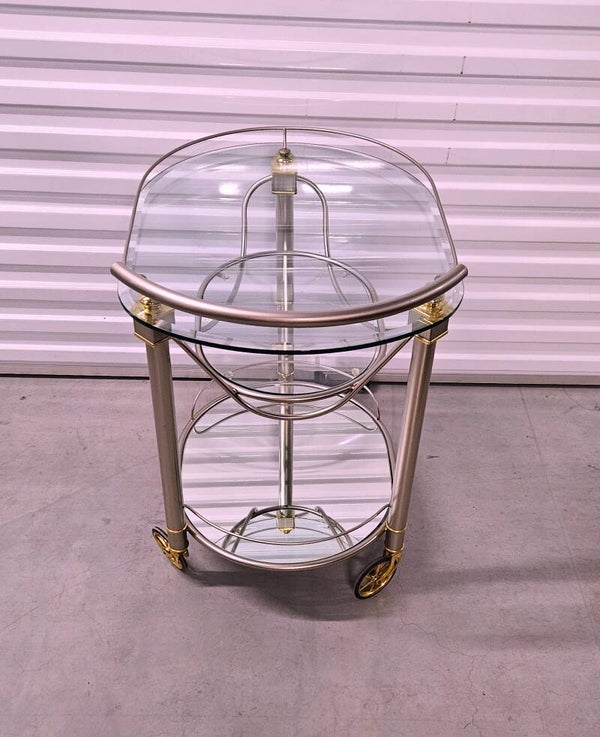Werkelijk geweldige barwagen gemaakt in Italië vol met decoratieve details. Het heeft in totaal 3 schalen: een grote glazen schaal bovenaan, een kleine glazen schaal in het midden en een spiegelschaal aan de onderkant.