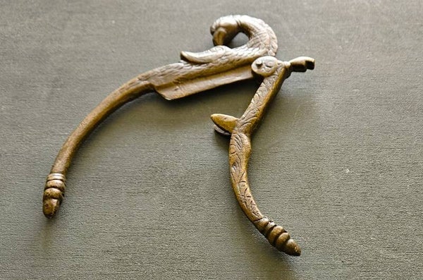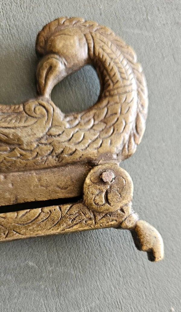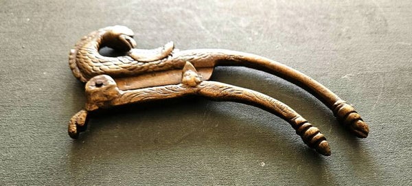 Dit is een vintage messing vogelkever notensnijder. Het is in goede vintage staat met wat oppervlakteroest op het mes en de pin. Dit stuk is ca. 18 cm lang en 9 cm breed.