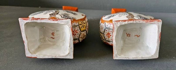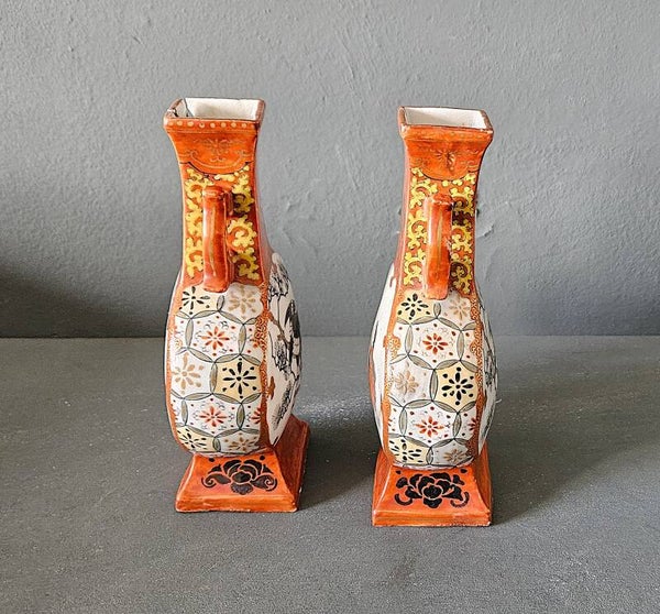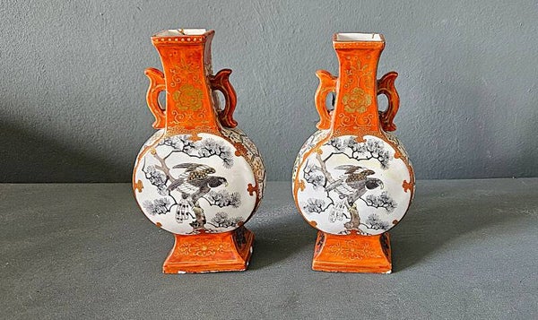 Paar Kutani porseleinen vazen met decor van vogel en dame, Japan 19e-/20e eeuw Afmeting: H. 18.5 x B. 10 x D. 6 cm Redelijke staat met gebruikssporen en leeftijd beschadiging