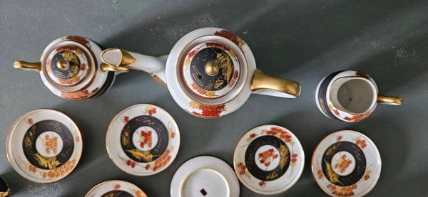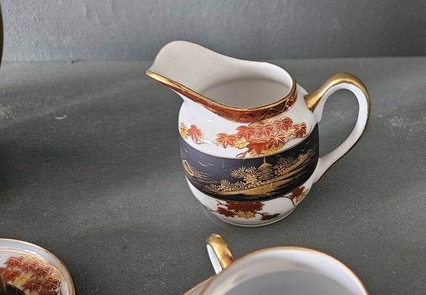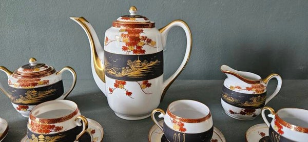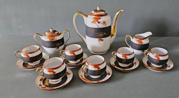 Een theeservies van zeer dun wit porselein, met 6 kopjes/schotels, een theepot, een suikerpot en een melkkannetje, met handbeschilderde landschaps- en herfstbladdecoraties, met wat goud op een zwarte achtergrond. Japan, vermoedelijk rond 1920/30.