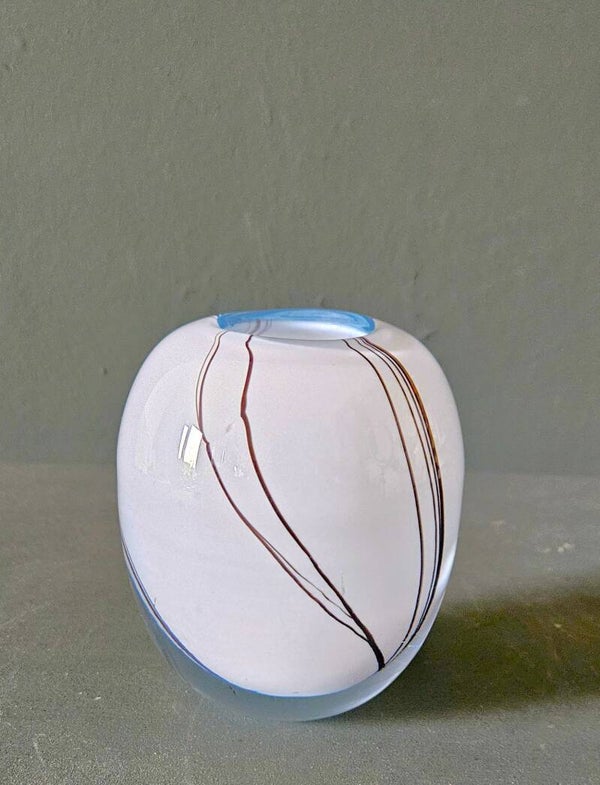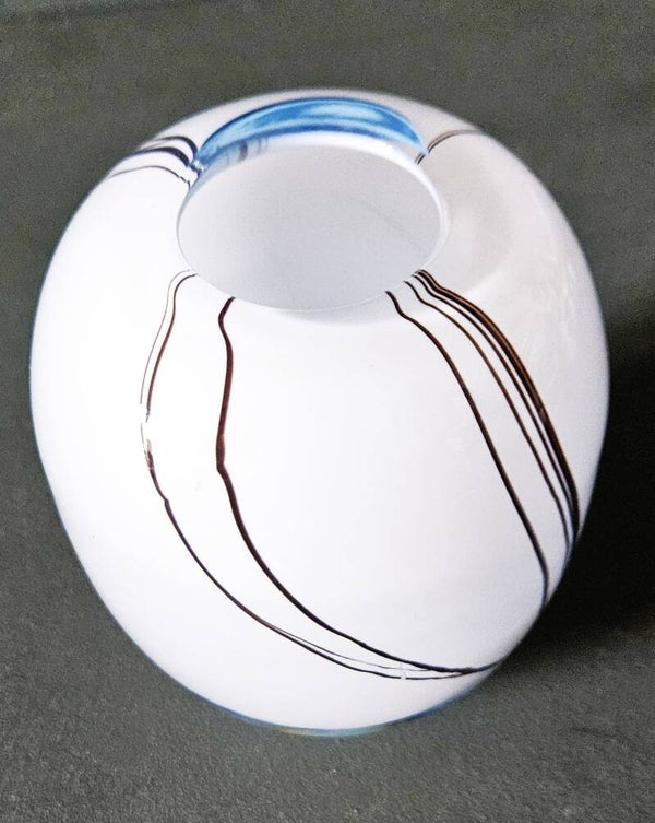 Een wit glazen vaas met donkere lijnen en helderglazen overlay, ontwerp & uitvoering Willem Heesen. 11 cm hoogste en ca, 10 cm diameter