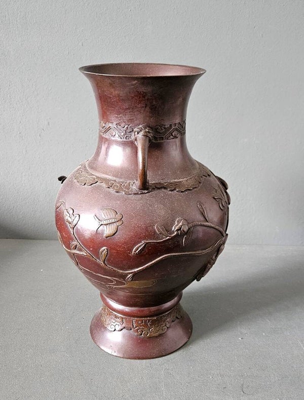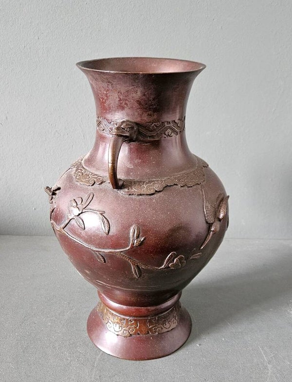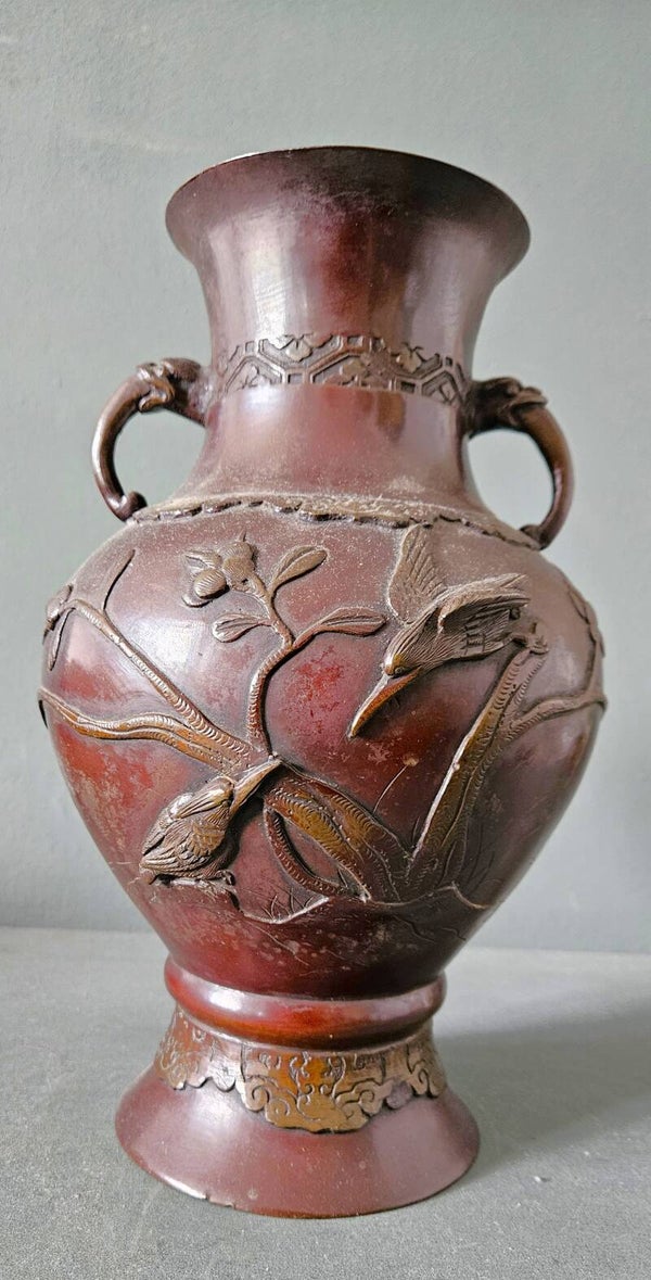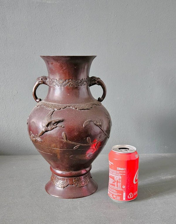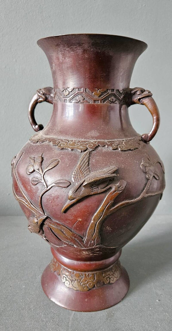 Een Japanse bronzen vaas, vroeg 20e eeuwOlifant handvatten, Drie ijsvogels en bloem detail. 32 cm hoog In goede staat met gebruikssporen