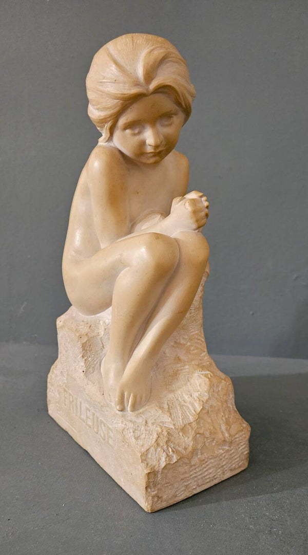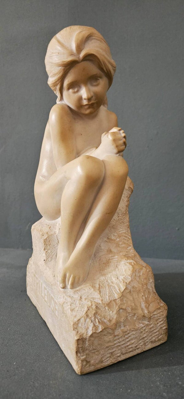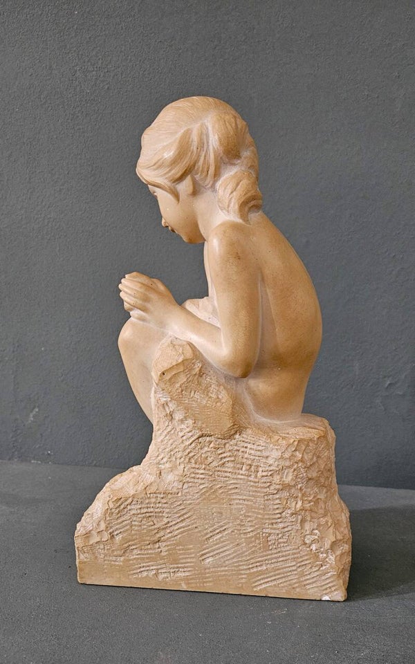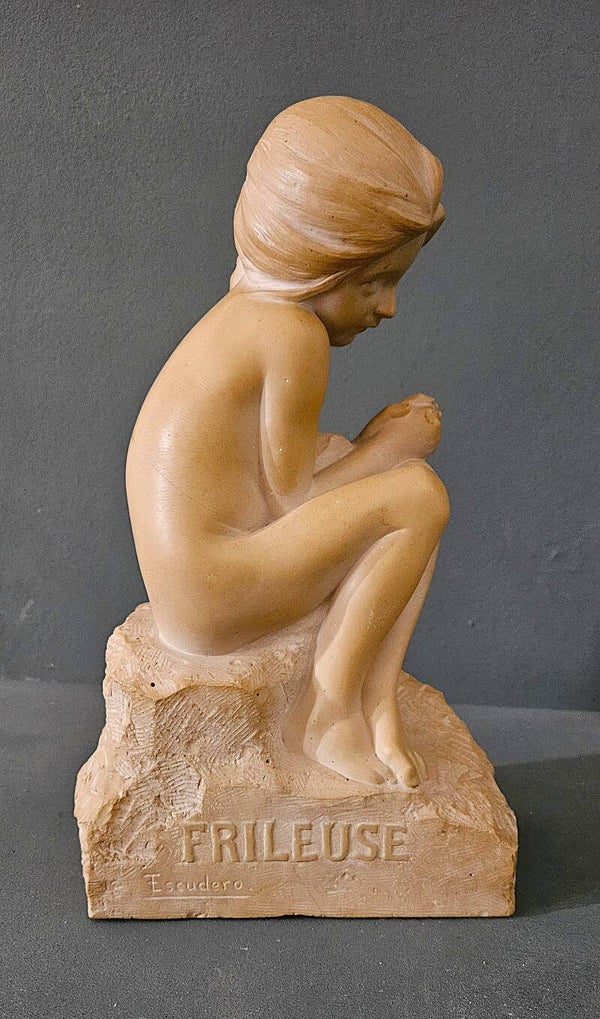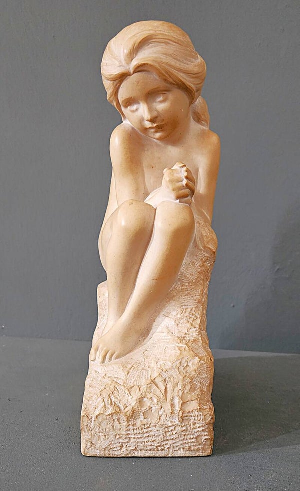 Een mooi en charmant natuursteen sculptuur van de jonge meisje, zij heeft het koud. De kwaliteit van het snijwerk is uitstekend. figuur is gesigneerd, Escudero. De conditie is uitstekende staat met licht leeftijd sporen. Rond 1930.