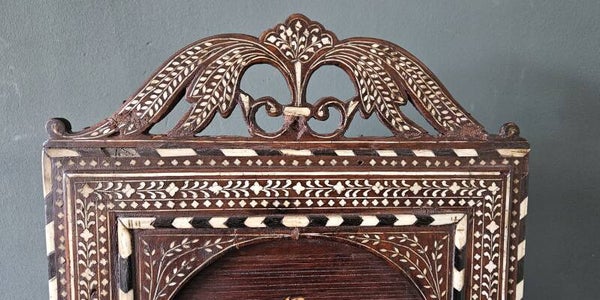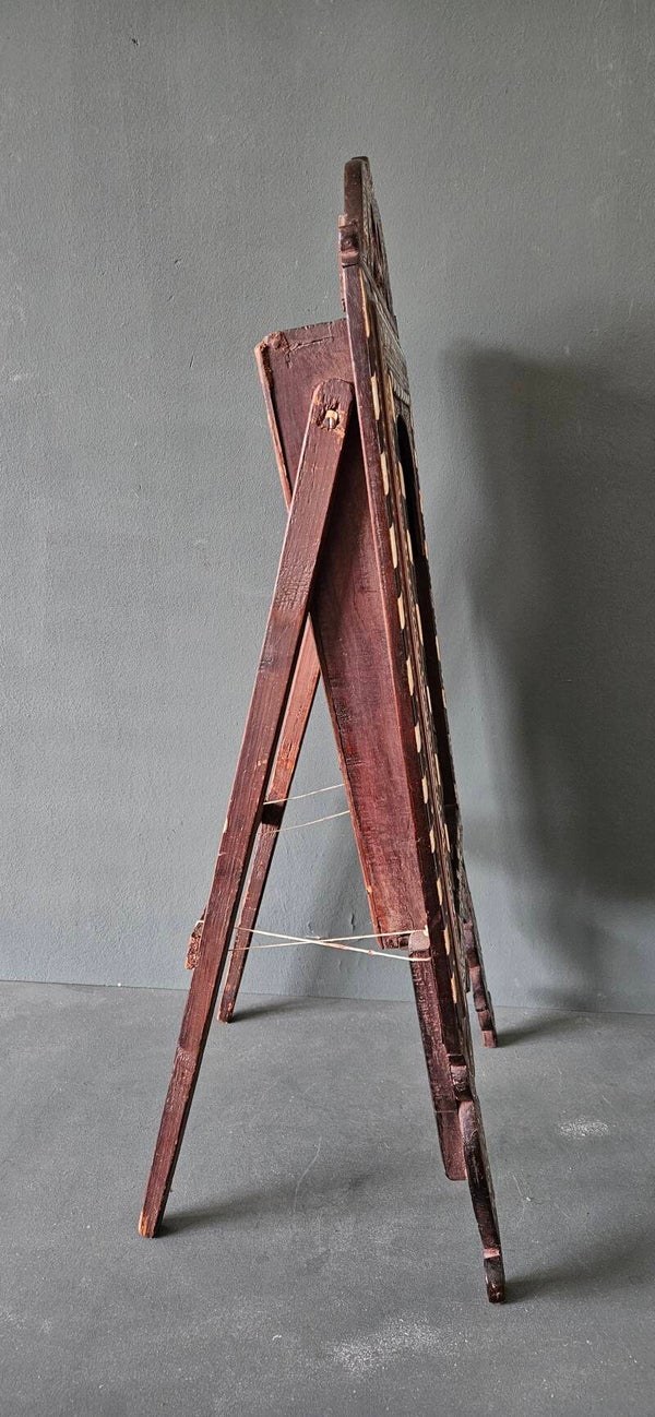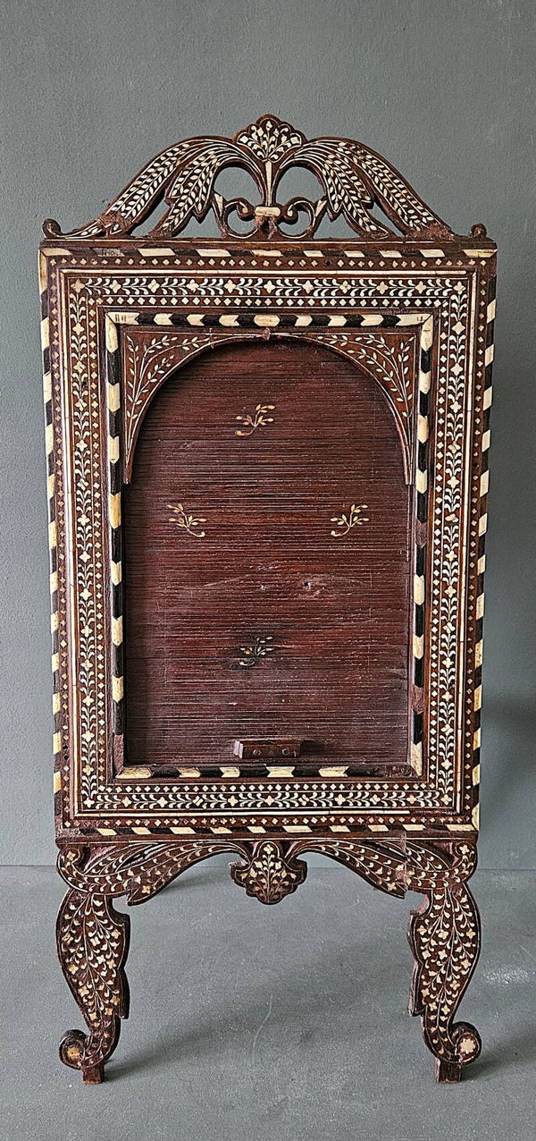 Houten spiegel met jaloezie rolluikje, ingelegd met been en ebbenhout, en ezelstandaard, Hoshiarpur, Noord India, circa 1900. H. 80 × B. 37 cm