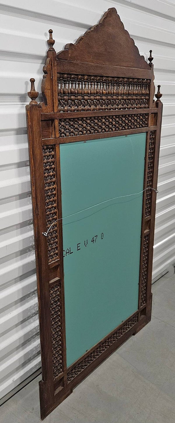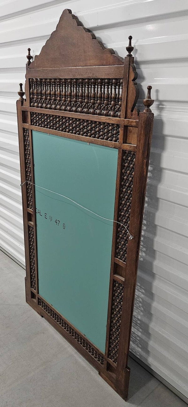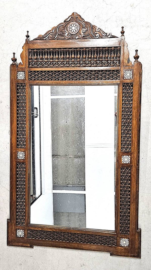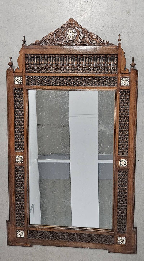 Indiaanse houten spiegel met Moorse vorm met gedraaide kruisbloemen, parelmoer inlegwerk. 20e eeuw