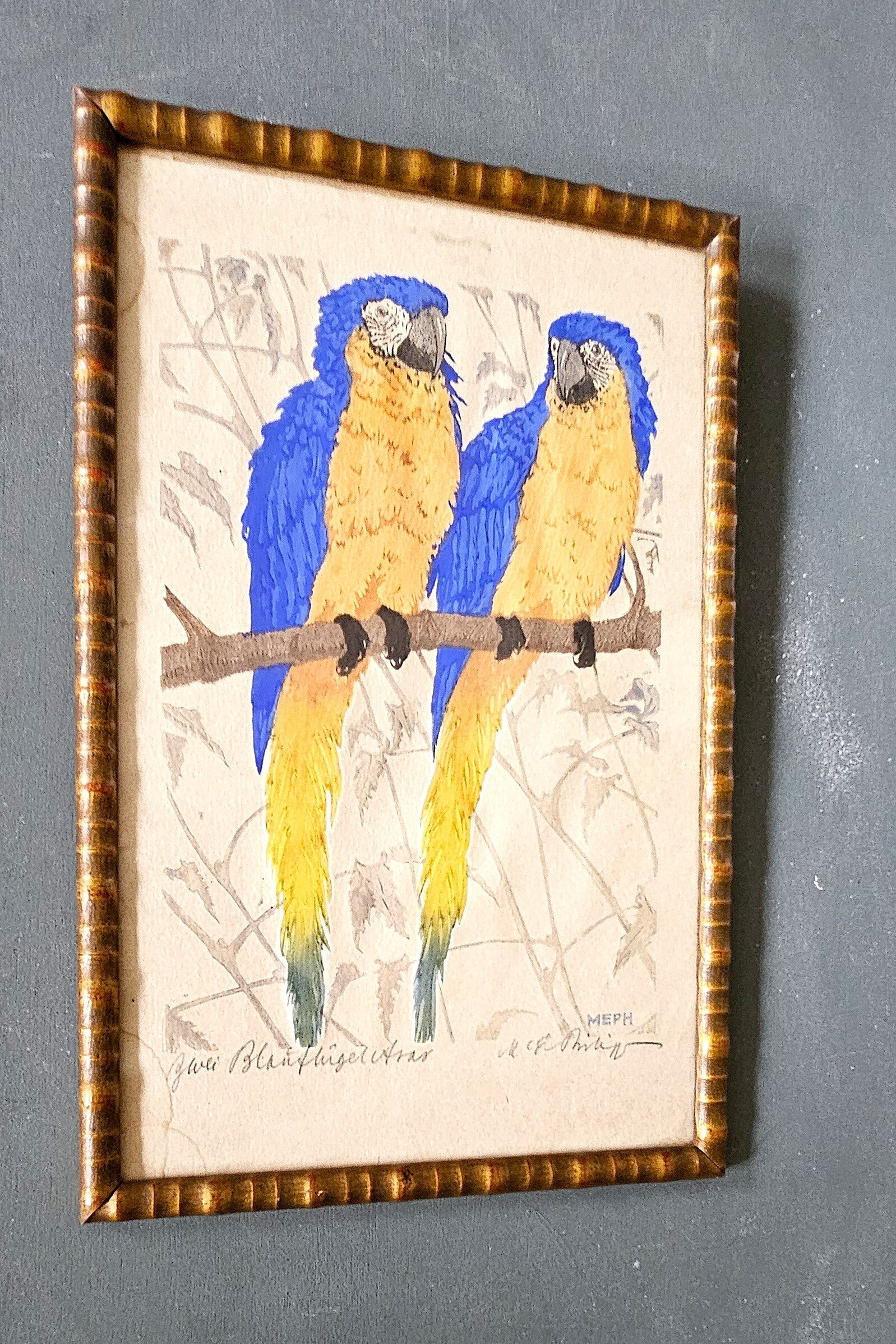 Martin Erich Philipp, "Twee blauwvleugelara's", kleurenhoutsnede uit 1922, ingelijst. Martin Erich Philipp (MEPH), 1887 Zwickau - 1978 Dresden, kleurenhoutsnede, Afmetingen H.29 x B.19 cm met lijst H.38 x B. 25 gesigneerd, gemonogrammeerd, achter glas in een mooie lijst