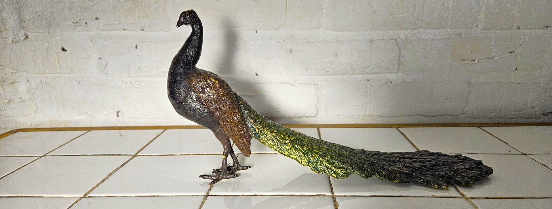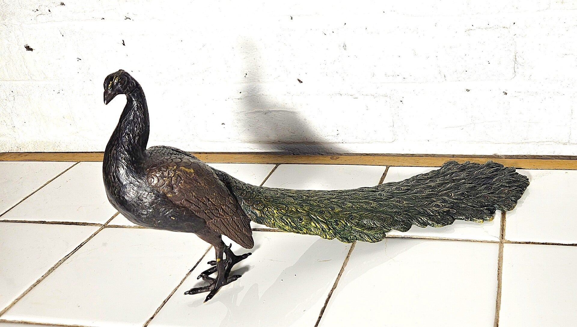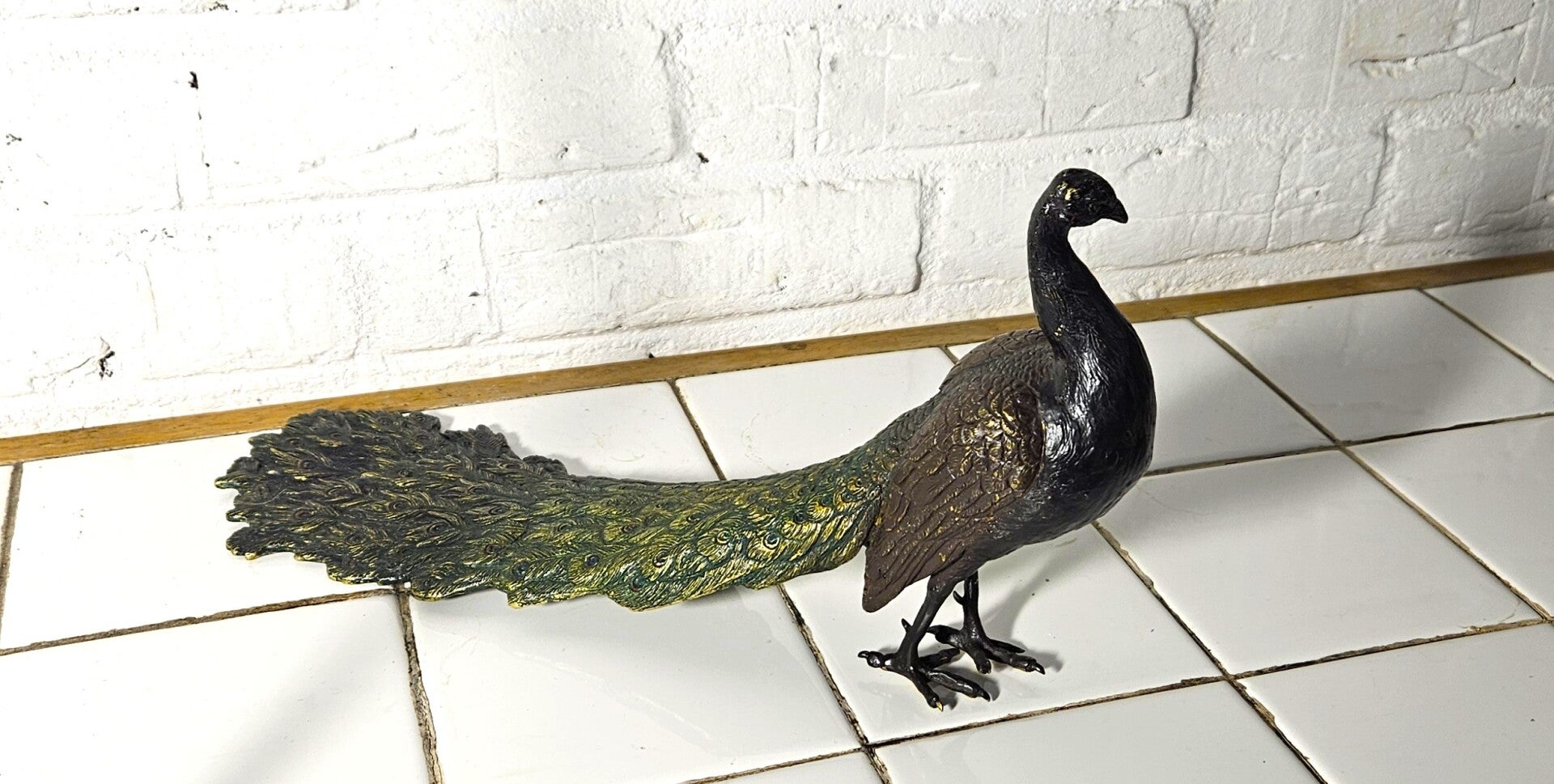 Dit is een beeldje van een pauw, Gemaakt van gegoten brons , met koudgeschilderde