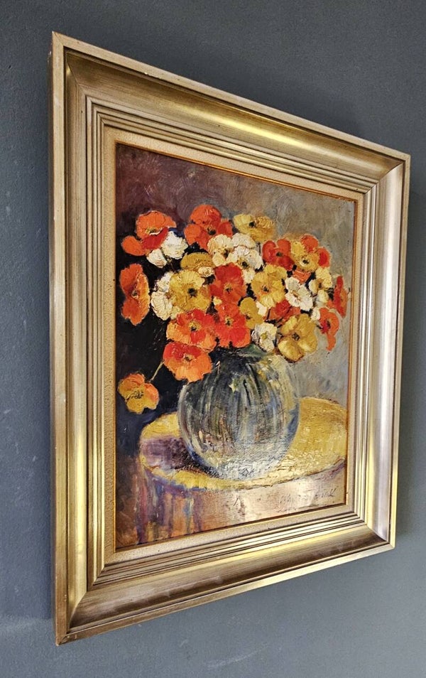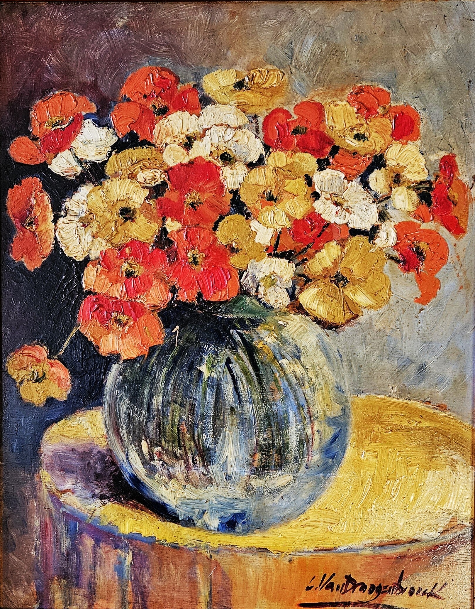 Dit schilderij is een stilleven van bloemen, getiteld "Bloemen", gemaakt door de Belgische kunstenaar, Leo Van Droogenbroeck (1905-1995)