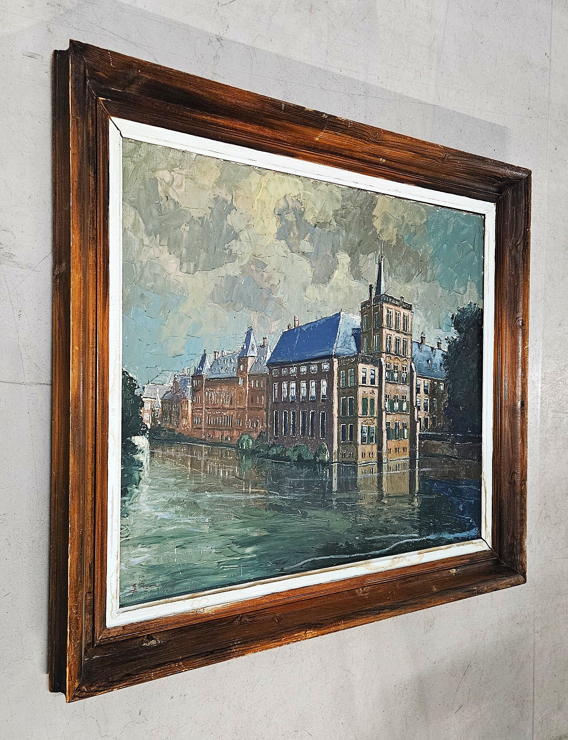 Het schilderij toont het Binnenhof in Den Haag, gezien vanaf de Hofvijver. Het werk is geschilderd door Jan van Goedhart, waarschijnlijk Jan Catharinus Adriaan Goedhart (1919-1991), die bekend stond om zijn schilderijen van grachten en landschappen.