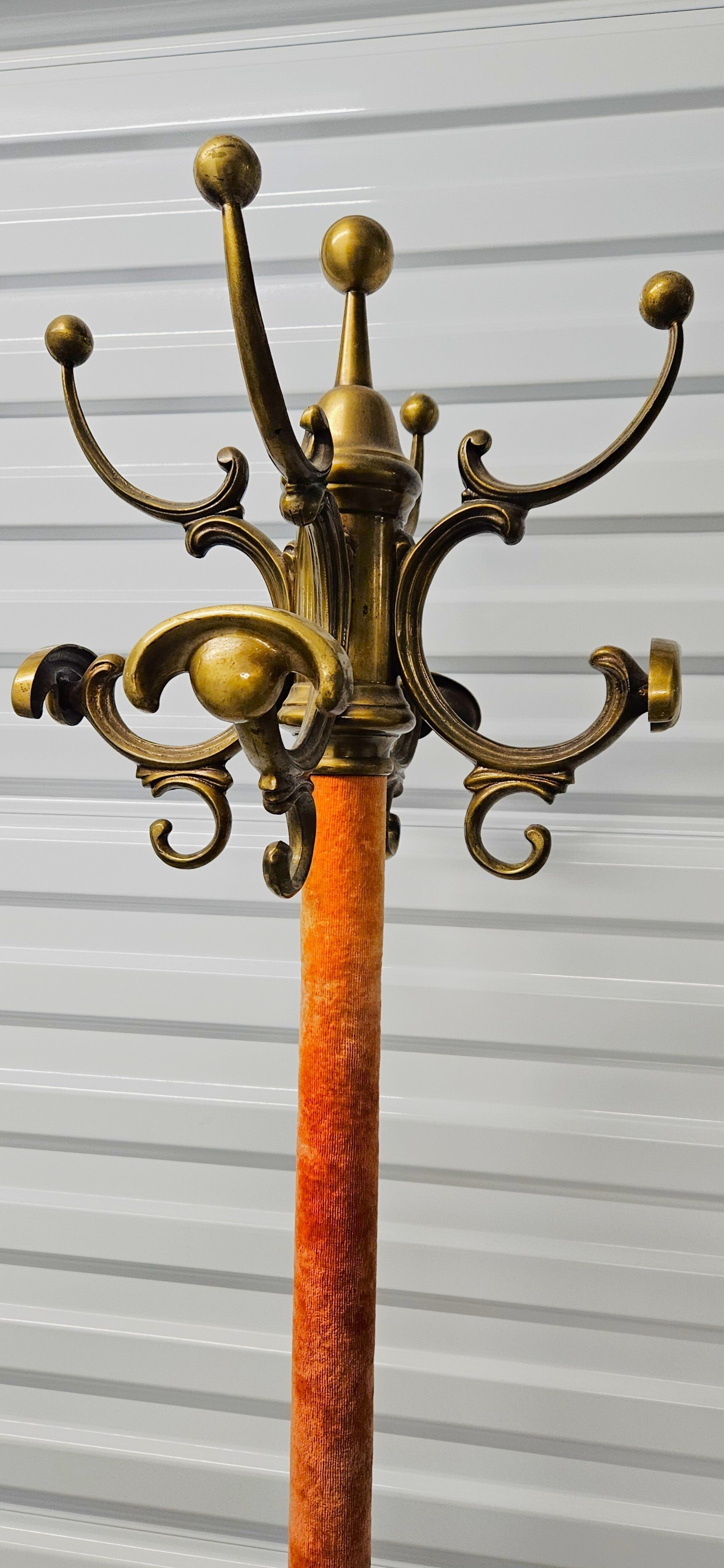 Een zeldzame Victoriaanse messing en rode fluwelen jas- en hoedenstandaard in Victoriaanse stijl, waarschijnlijk daterend uit het einde van de 19e eeuw (circa 1880). De stijl wordt vaak aangeduid als een hallenboom of hallenstandaard,