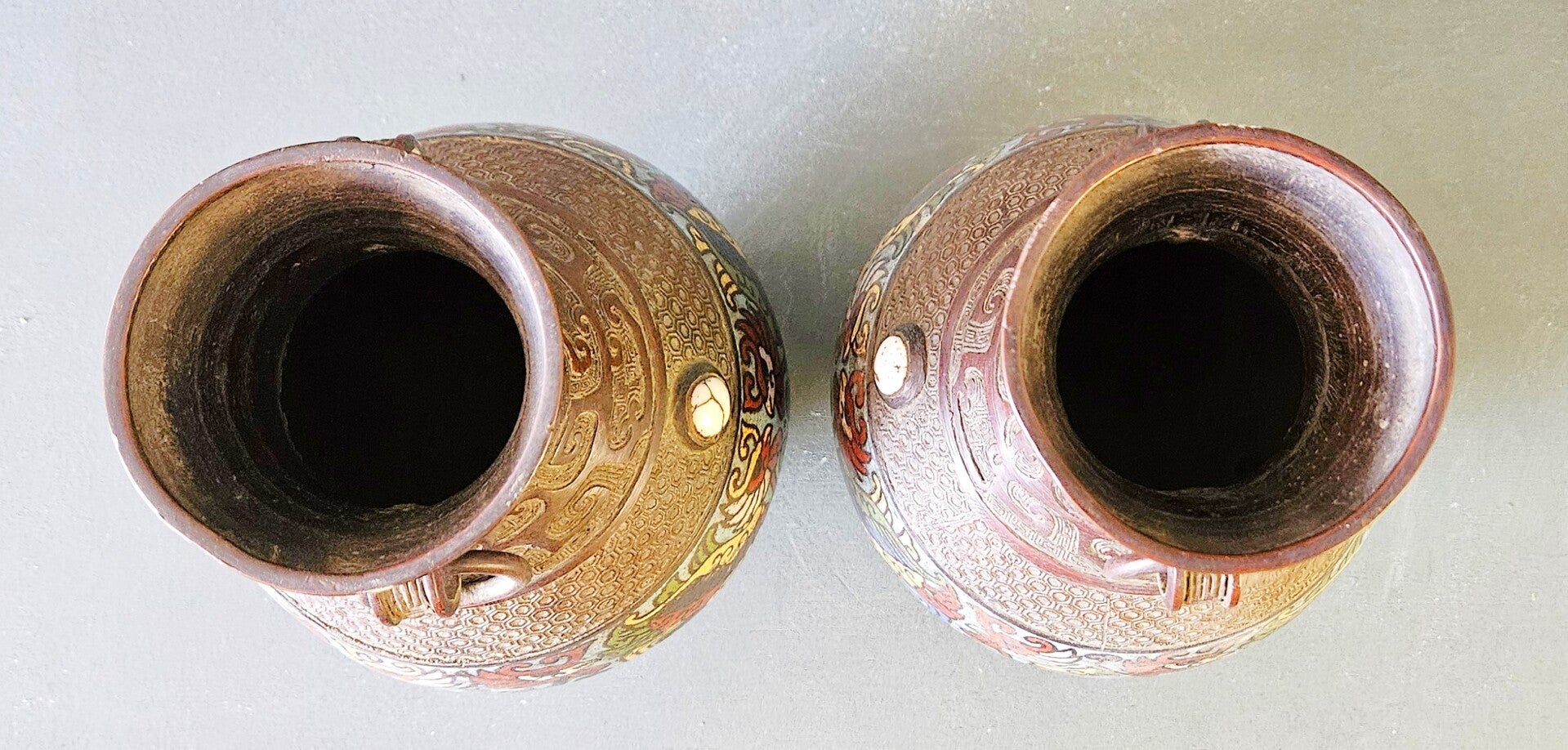 Een paar antieke Japanse bronzen champlevé en cloisonné emaille vazen met twee handvatten , daterend uit de late 19e eeuwse Meiji-periode (1868-1912)
