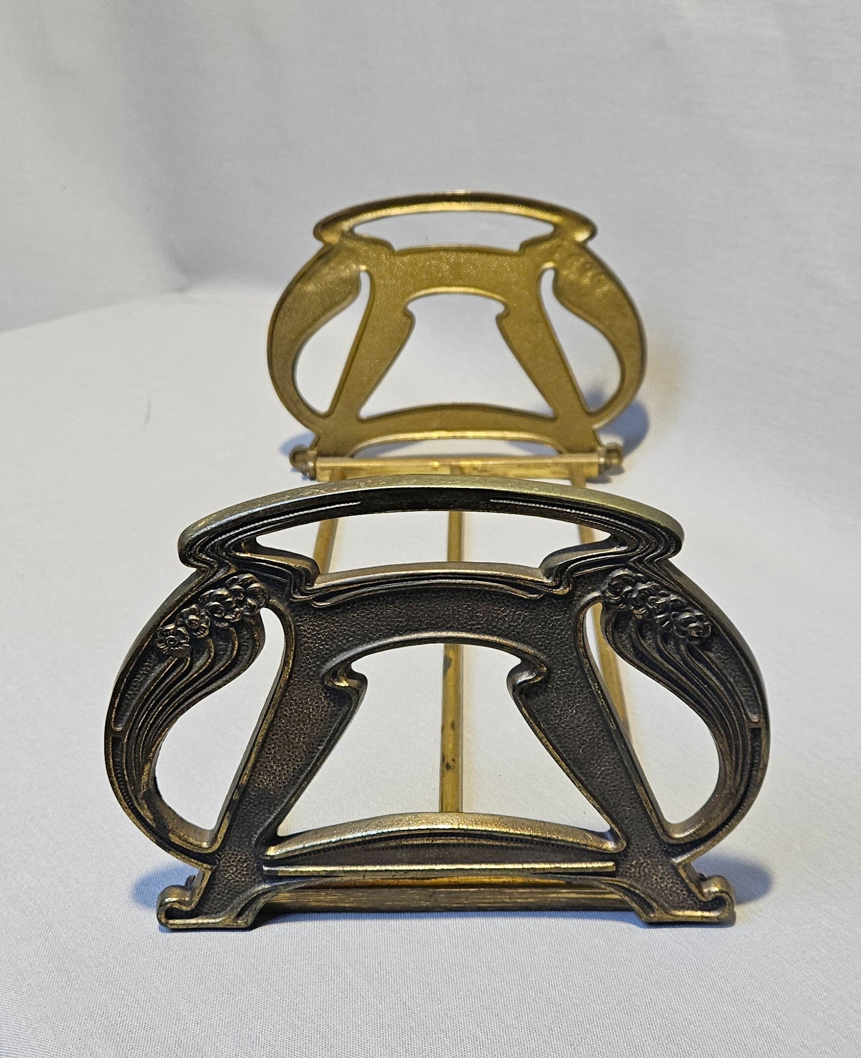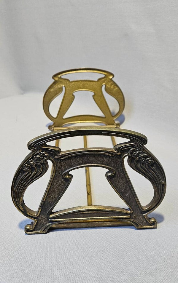 Deze boekensteunen zijn vaak gemaakt van messing, en zijn versierd met kenmerkende Art Nouveau-motieven, zoals vloeiende lijnen en bloemdecoraties. Veel van deze sets zijn geproduceerd door de Judd Manufacturing Company, een bekende fabrikant van dit soort items in de vroege 20e eeuw. Ze worden vaak aangeduid als 'uitschuifbare boekensteunen' omdat ze met een telescopisch mechanisme de afstand tussen de twee steunen kunnen aanpassen, zodat ze verschillende hoeveelheden boeken kunnen vasthouden.