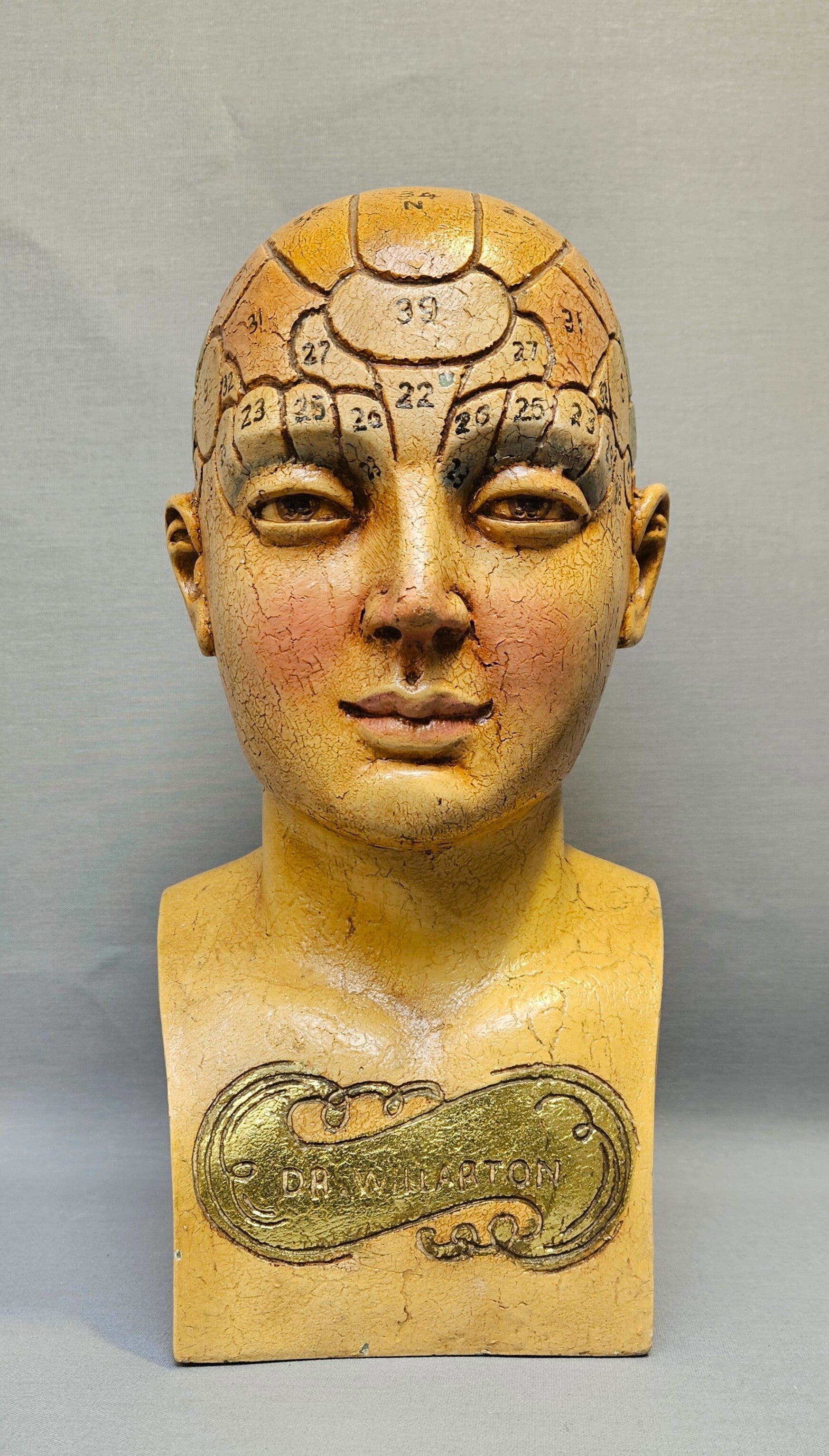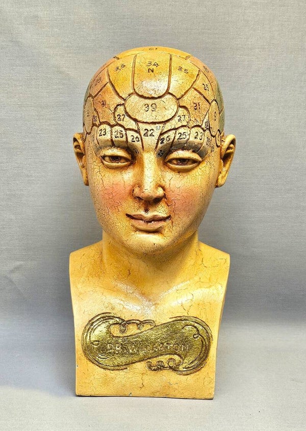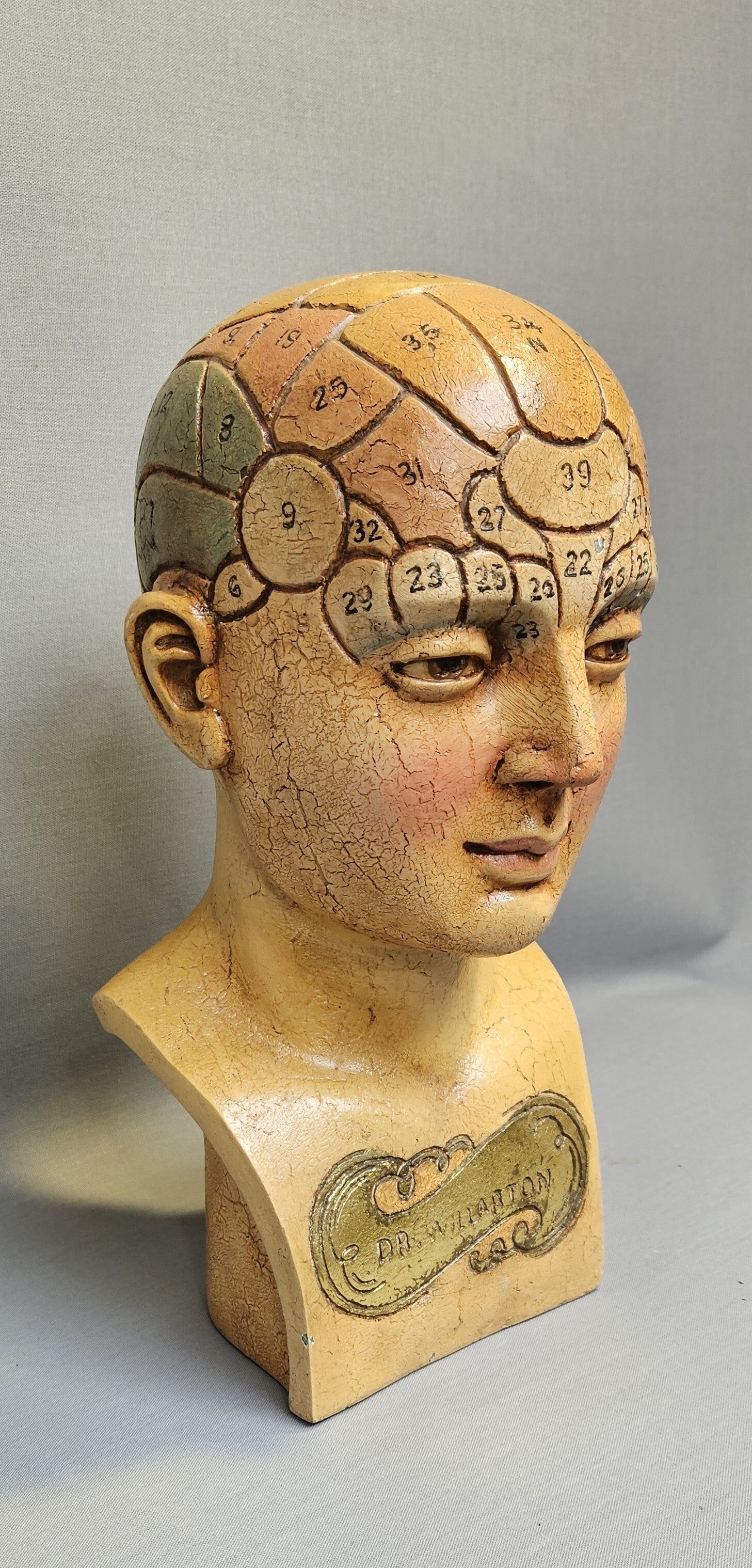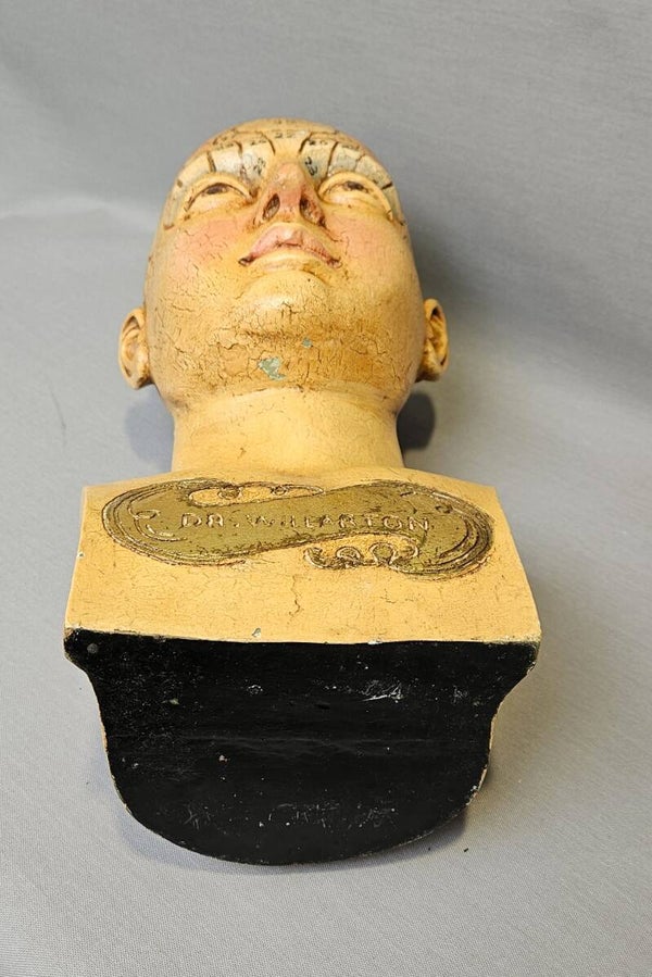 Een prachtig gedetailleerde frenologie buste van de bekende Dr. Willarton. Dit object is een fascinerende herinnering aan de 20e-eeuwse pseudowetenschap waarbij men geloofde dat iemands karakter en mentale vermogens afgelezen konden worden aan de hand van knobbels op de schedel.