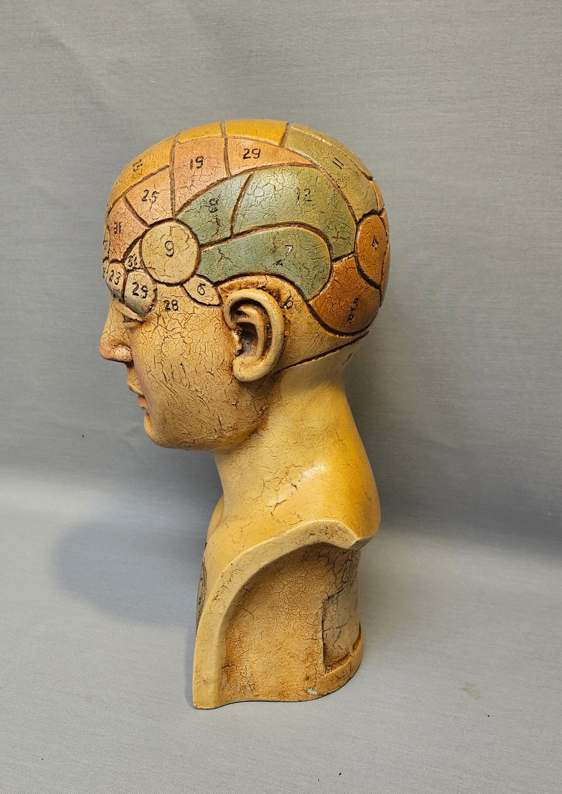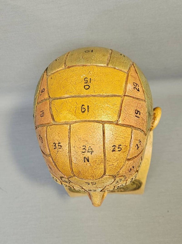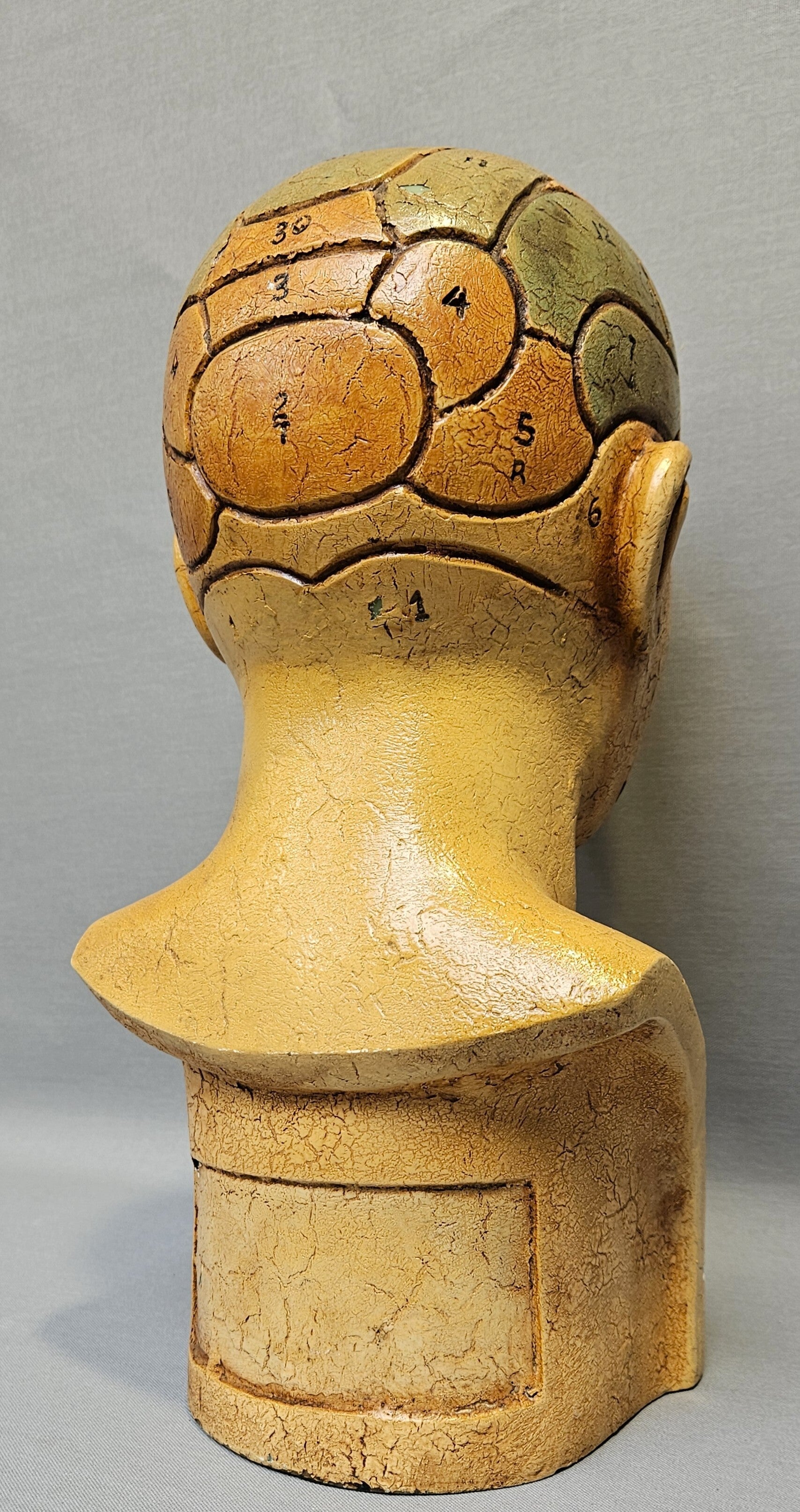 Een prachtig gedetailleerde frenologie buste van de bekende Dr. Willarton. Dit object is een fascinerende herinnering aan de 20e-eeuwse pseudowetenschap waarbij men geloofde dat iemands karakter en mentale vermogens afgelezen konden worden aan de hand van knobbels op de schedel.