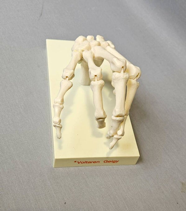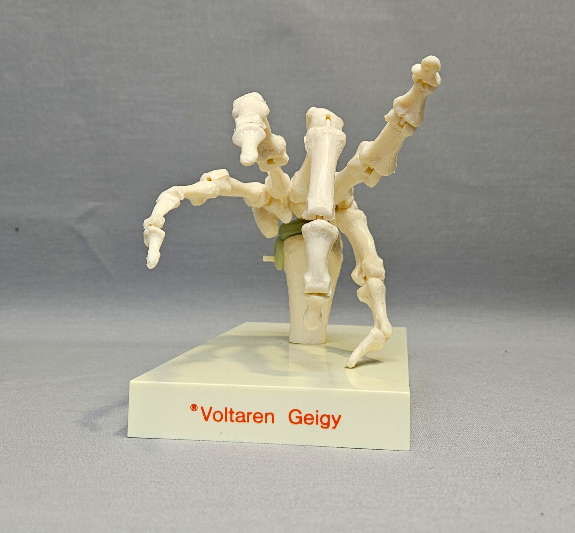 Een authentiek vintage anatomisch model van een menselijk handskelet, uitgegeven door de farmaceutische firma Geigy ter promotie van de bekende pijnstiller .Voltaren