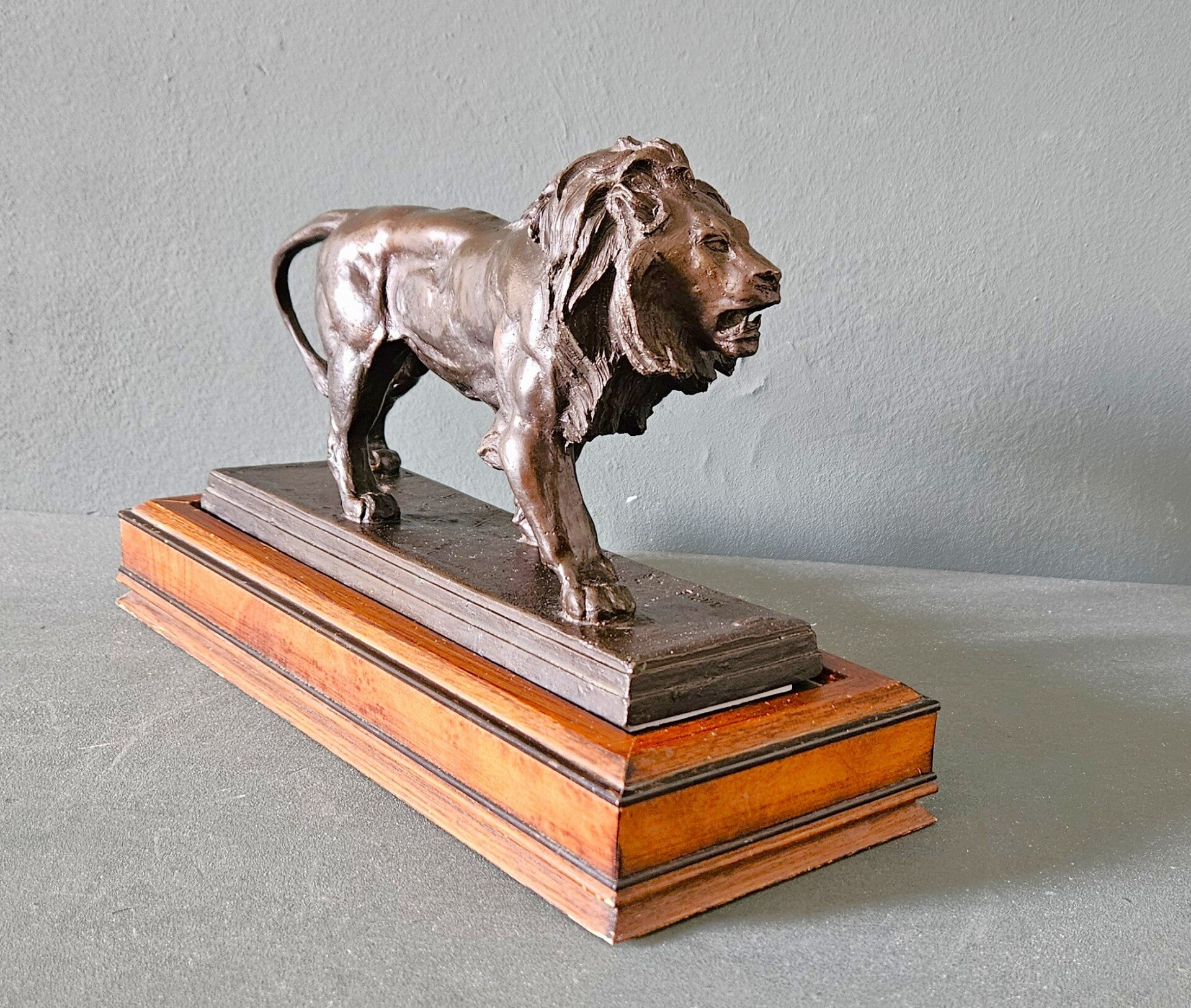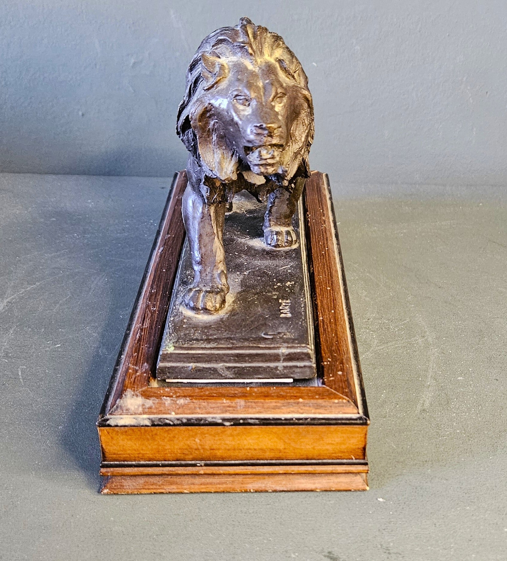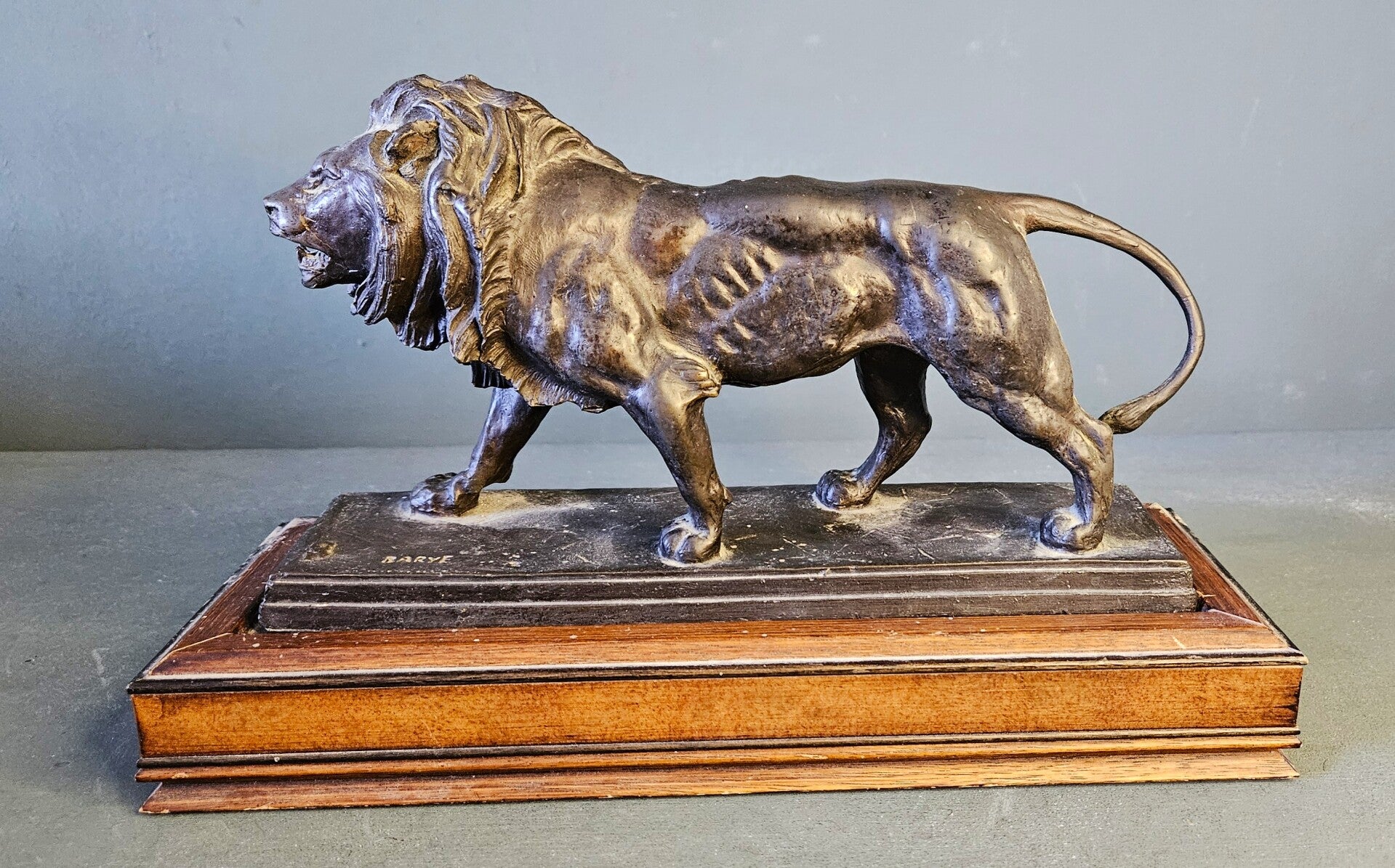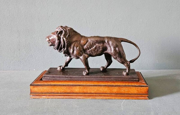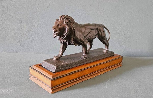 Het beeld draagt de gegoten signatuur "BARYE" op de terrace en staat op een stijlvolle houten sokkel. Deze editie staat bekend om zijn kwalitatieve afwerking en historisch getrouwe weergave van Barye's meesterwerk.