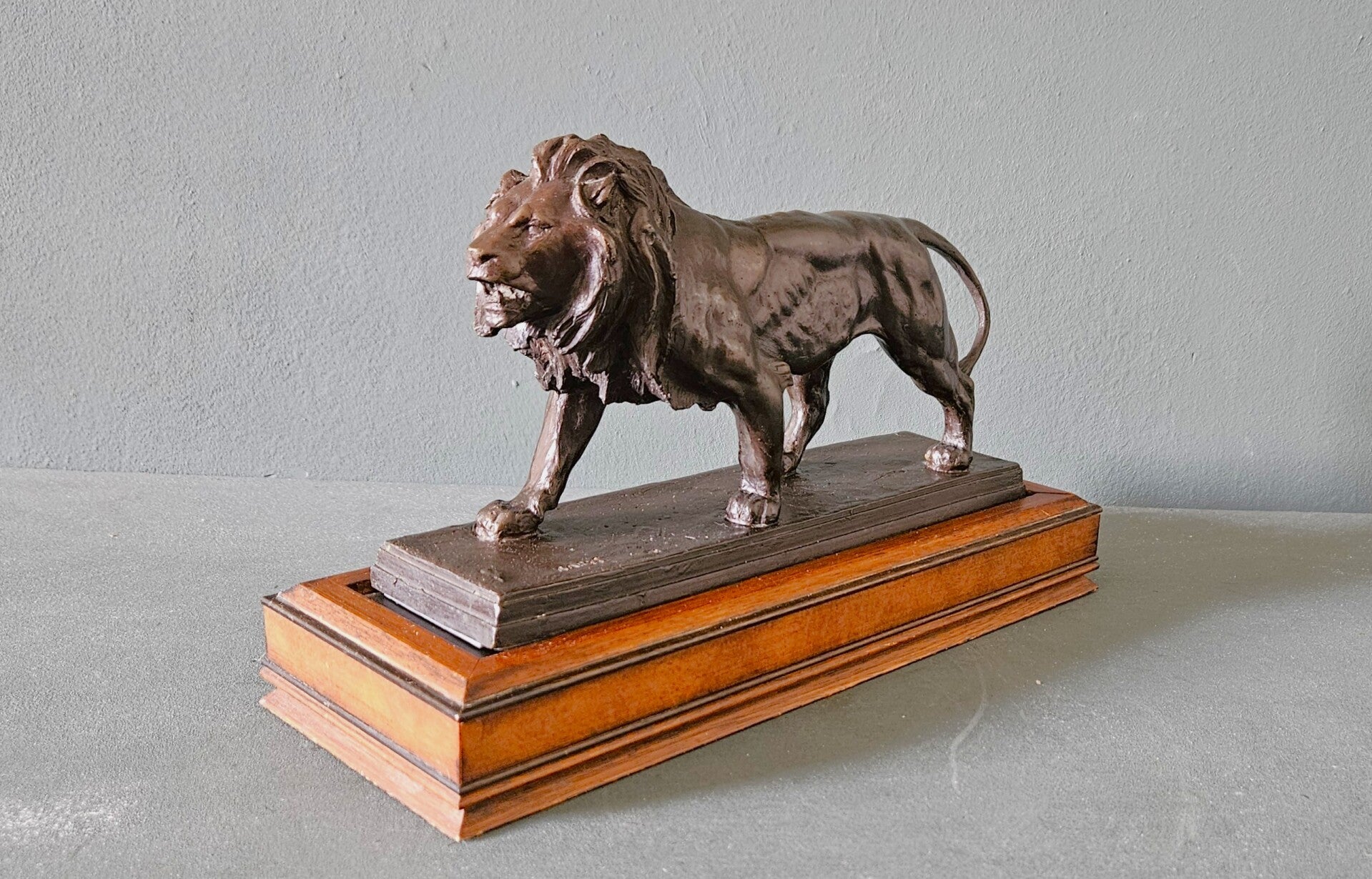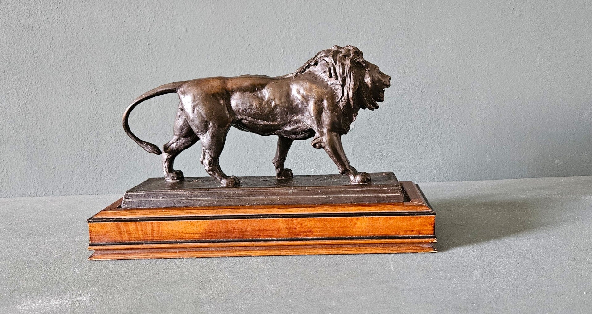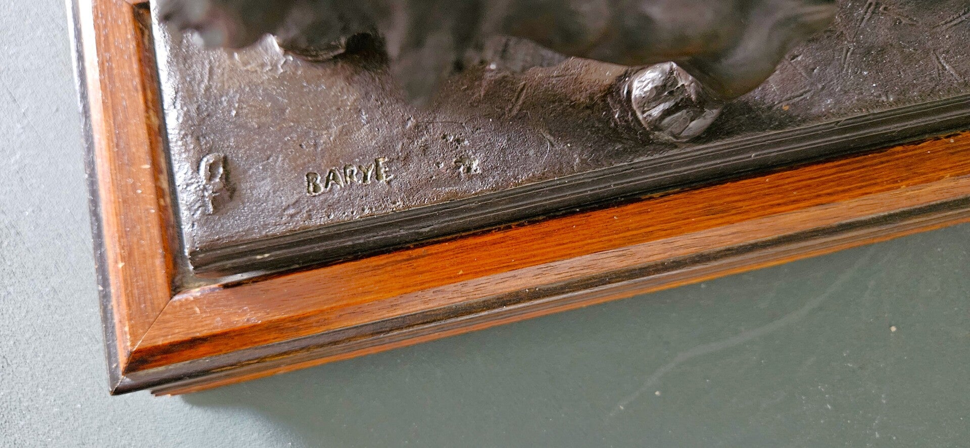 Het beeld draagt de gegoten signatuur "BARYE" op de terrace en staat op een stijlvolle houten sokkel. Deze editie staat bekend om zijn kwalitatieve afwerking en historisch getrouwe weergave van Barye's meesterwerk.