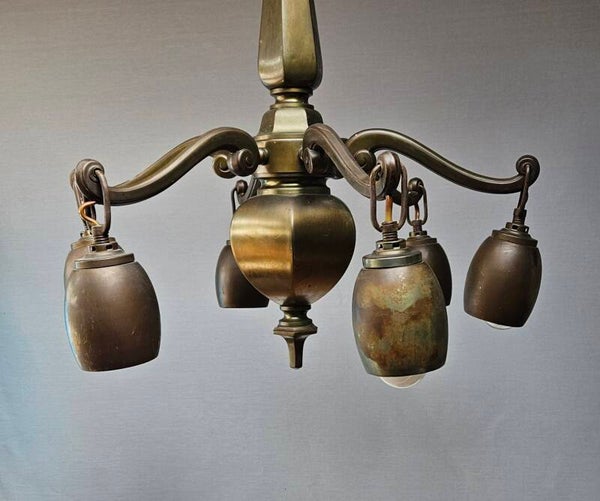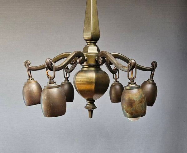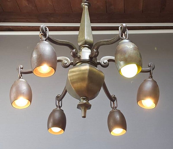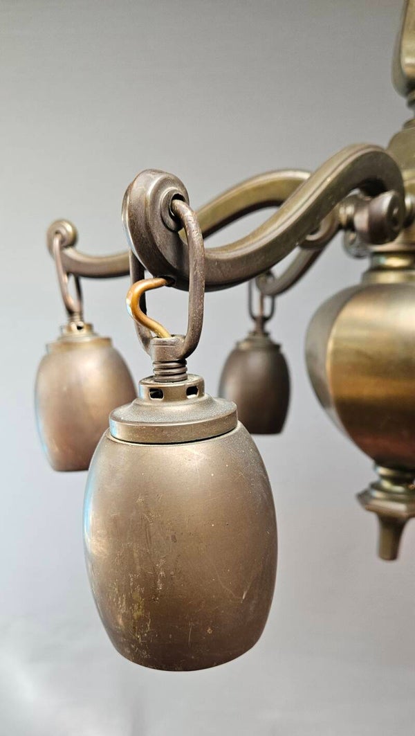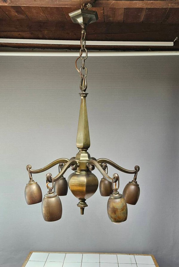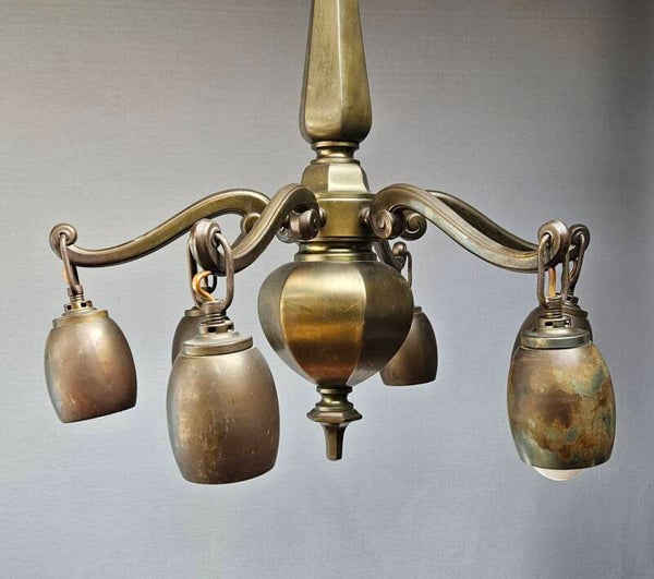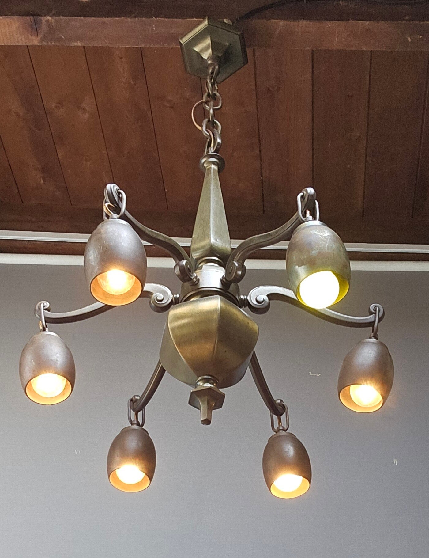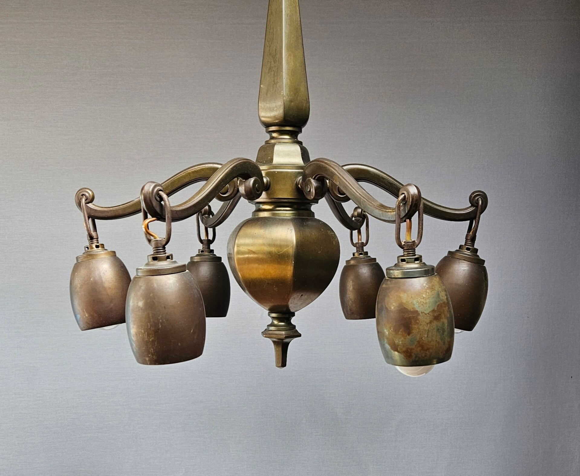 Een zeer statige en karaktervolle zespuntige kroonluchter, vervaardigd uit massief gepatineerd messing. Dit armatuur dateert uit de vroege 20e eeuw (circa 1920-1930) en combineert de strakke lijnen van de Art Deco met de ambachtelijke uitstraling van de Arts & Crafts beweging.