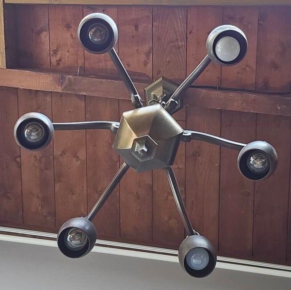 De lamp onderscheidt zich door zijn robuuste middenstuk en zes sierlijk gebogen armen waaraan klokvormige kappen hangen. Dankzij de natuurlijke patina heeft het metaal een prachtige, diepdonkere bruin-gouden tint die de historische waarde benadrukt.